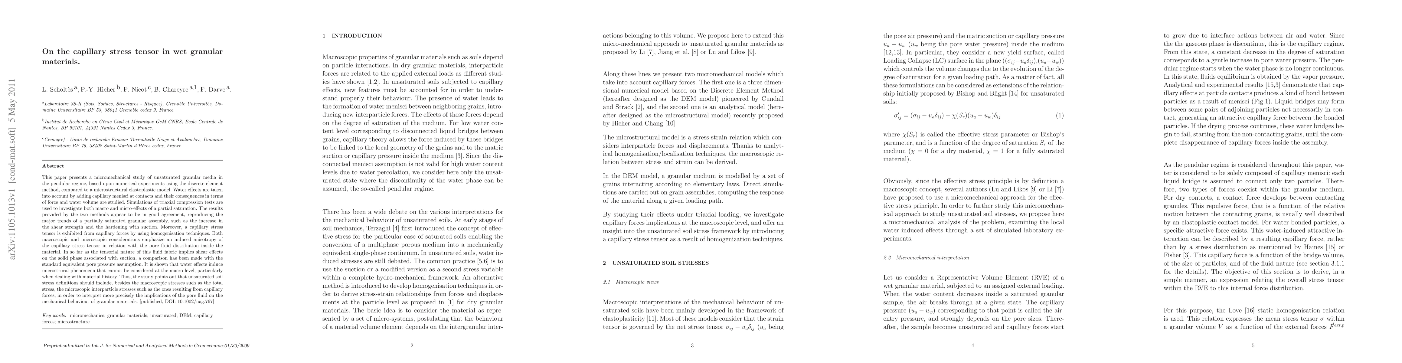 This paper investigates the capillary stress tensor in unsaturated granular materials using numerical simulations and microstructural models, revealing the impact of capillary forces on the mechanical behavior. It highlights the importance of considering microscopic interparticle stresses, especially capillary forces, in defining the stress state of unsaturated soils.