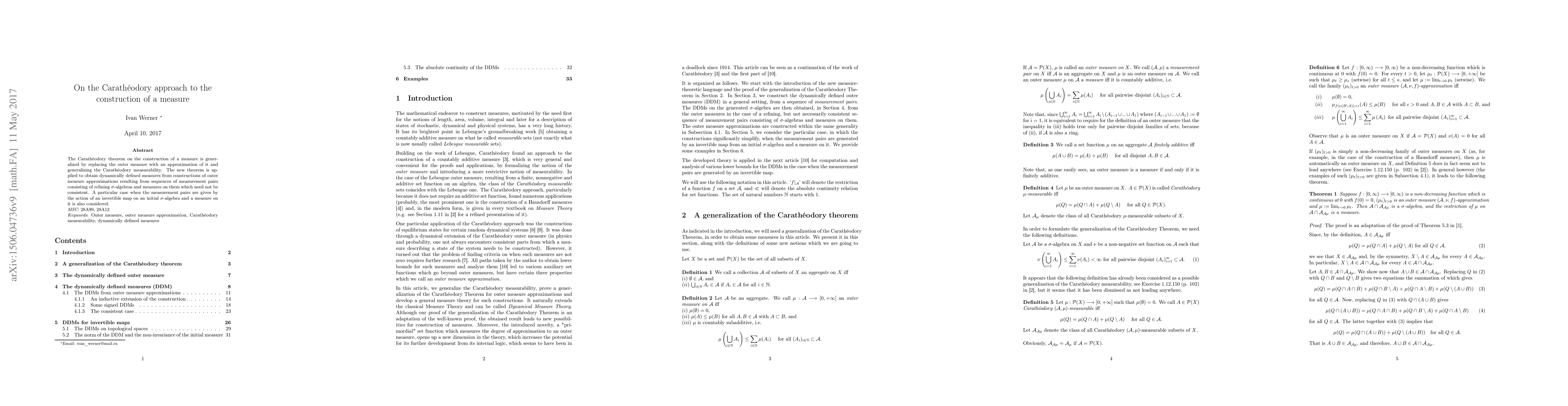 Summary: This paper generalizes Carathéodory's measure construction theorem by using outer measure approximations and broader measurability criteria, applying it to dynamically defined measures from non-consistent measurement sequences, and examining a specific scenario involving invertible maps.