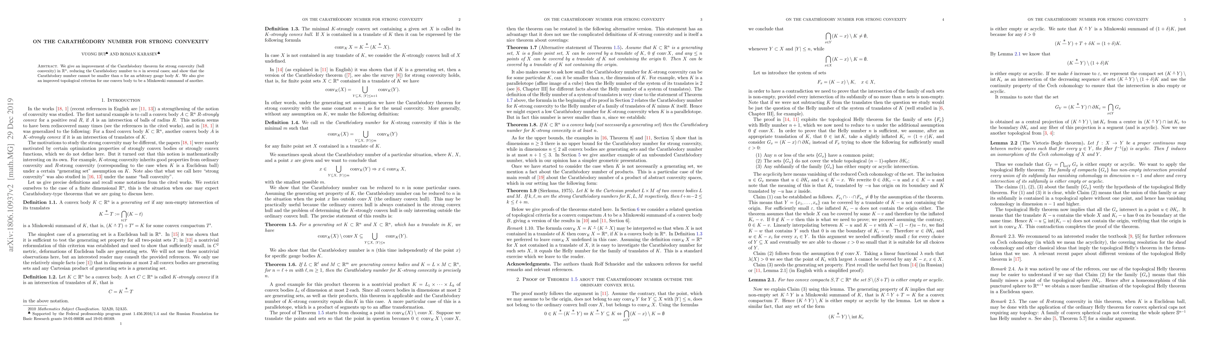 This paper improves the Carathéodory theorem for strong convexity in $\mathbb{R}^n$, reducing the Carathéodory number to $n$ in specific cases and proving that it cannot be smaller for general gauge bodies. It also presents an enhanced topological criterion for determining Minkowski summands of convex bodies.