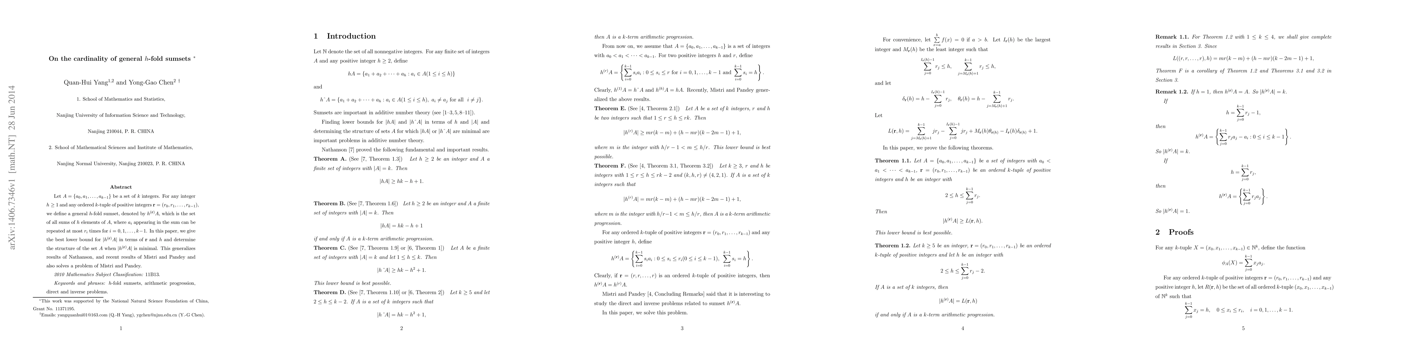 This paper establishes a lower bound for the cardinality of general h-fold sumsets and determines the structure of set A when this cardinality is minimal, solving a problem in combinatorial mathematics.