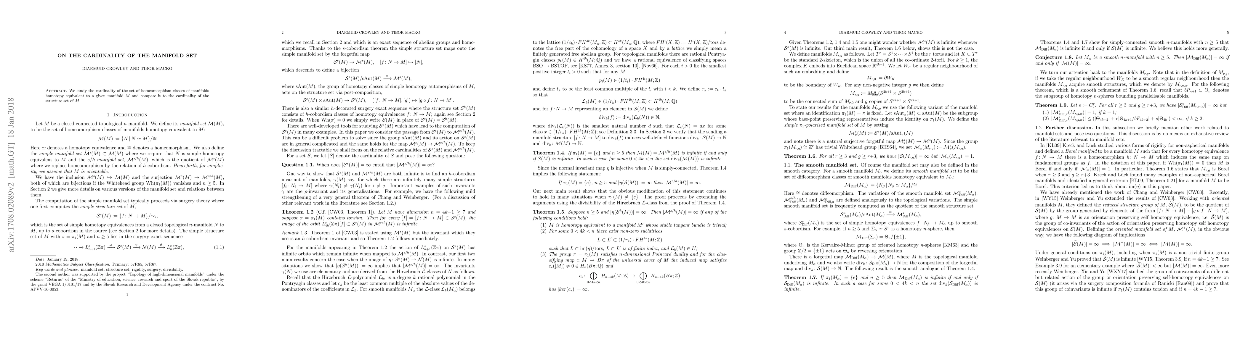 Summary: This paper explores the cardinality of the set of manifolds homotopy equivalent to a given manifold M, comparing it to the cardinality of M's structure set, aiming to understand the relationship between these two cardinalities.