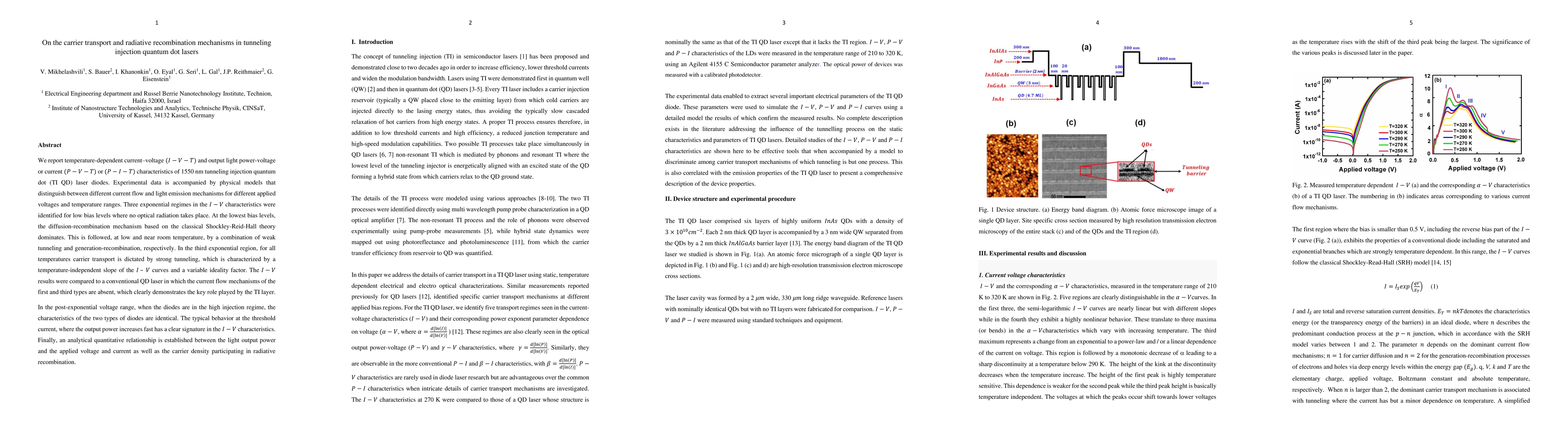 This paper investigates the temperature-dependent current-voltage and light output characteristics of 1550 nm tunneling injection quantum dot lasers, identifying three distinct exponential regimes in the I-V characteristics. It establishes a quantitative relationship between light output power and applied voltage/current, highlighting the role of the tunneling injection layer in carrier transport and radiative recombination mechanisms.