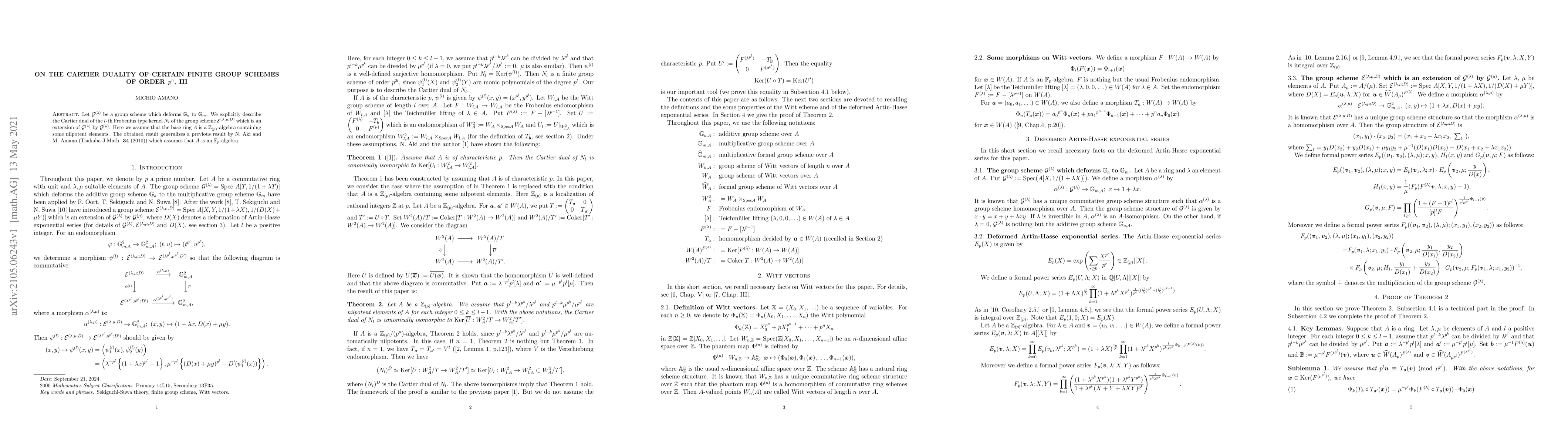 Let $\mathcal{G}^{(\lambda)}$ be a group scheme which deforms $\mathbb{G}_a$ to $\mathbb{G}_m$. We explicitly describe the Cartier dual of the $l$-th Frobenius type kernel $N_l$ of the group scheme $\mathcal{E}^{(\lambda,\mu;D)}$ which is an extension of $\mathcal{G}^{(\lambda)}$ by $\mathcal{G}^{(\mu)}$. Here we assume that the base ring $A$ is a $\mathbb{Z}_{(p)}$-algebra containing some nilpotent elements. The obtained result generalizes a previous result by N. Aki and M. Amano (Tsukuba J.Math. $\textbf{34}$ (2010)) which assumes that $A$ is an $\mathbb{F}_p$-algebra.
