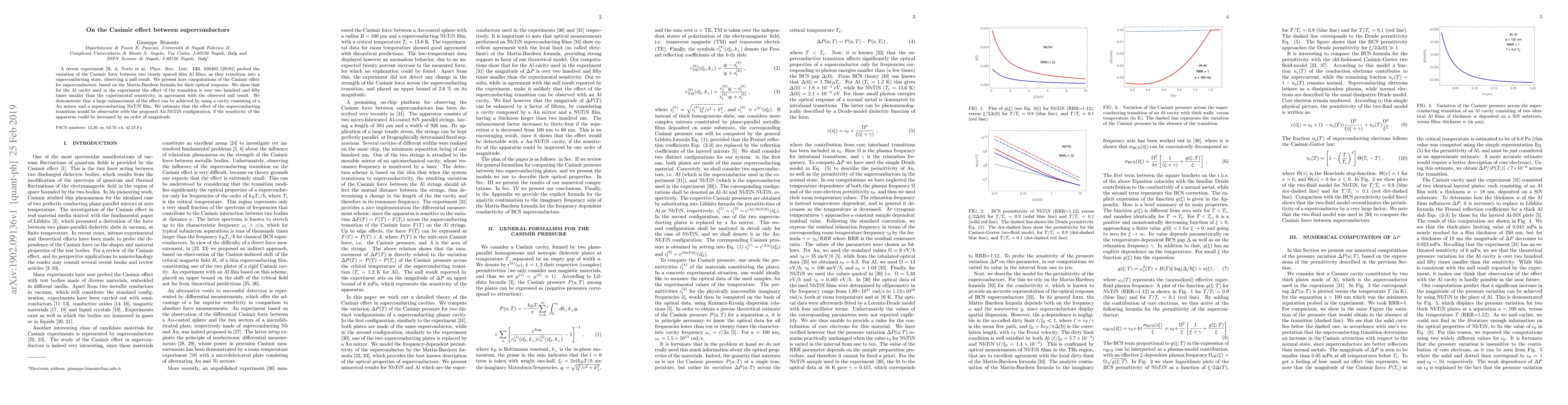 A recent experiment [R. A. Norte et al. Phys. Rev. Lett. {\bf 121}, 030405 (2018)] probed the variation of the Casimir force between two closely spaced thin Al films, as they transition into a superconducting state, observing a null result. We present here computations of the Casimir effect for superconductors, based on the Mattis-Bardeen formula for their optical response. We show that for the Al cavity used in the experiment the effect of the transition is over two hundred and fifty times smaller than the experimental sensitivity, in agreement with the observed null result. We demonstrate that a large enhancement of the effect can be achieved by using a cavity consisting of a Au mirror and a superconducting NbTiN film. We estimate that the effect of the superconducting transition would be observable with the proposed Au-NbTiN configuration, if the sensitivity of the apparatus could be increased by an order of magnitude.