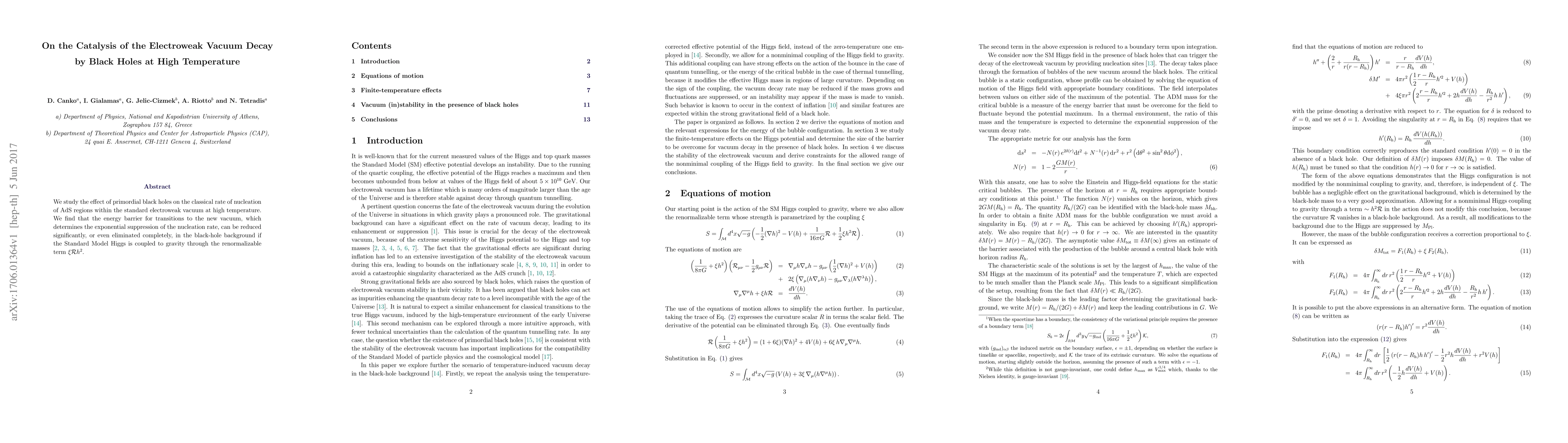 We study the effect of primordial black holes on the classical rate of nucleation of AdS regions within the standard electroweak vacuum at high temperature. We find that the energy barrier for transitions to the new vacuum, which determines the exponential suppression of the nucleation rate, can be reduced significantly, or even eliminated completely, in the black-hole background if the Standard Model Higgs is coupled to gravity through the renormalizable term $\xi {\cal R} h^2$.