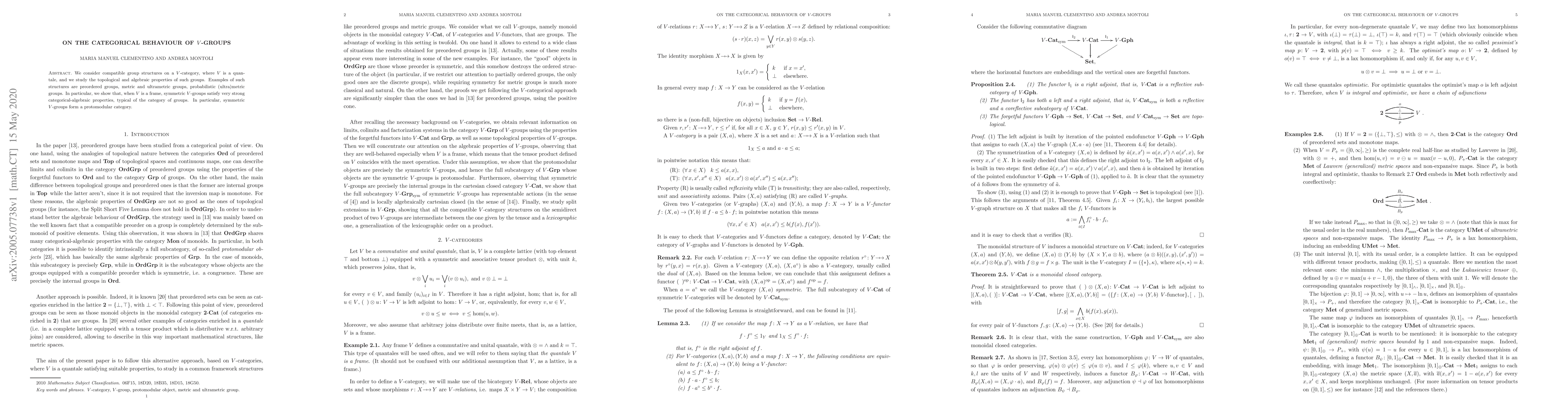 We consider compatible group structures on a $V$-category, where $V$ is a quantale, and we study the topological and algebraic properties of such groups. Examples of such structures are preordered groups, metric and ultrametric groups, probabilistic (ultra)metric groups. In particular, we show that, when $V$ is a frame, symmetric $V$-groups satisfy very strong categorical-algebraic properties, typical of the category of groups. In particular, symmetric $V$-groups form a protomodular category.