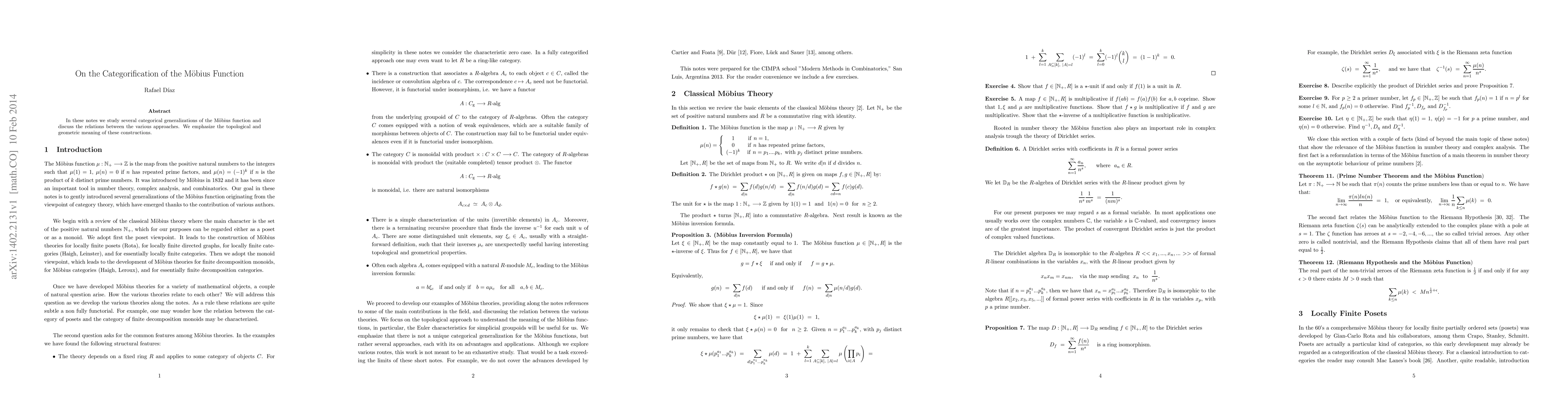 In these notes we study several categorical generalizations of the M\"obius function and discuss the relations between the various approaches. We emphasize the topological and geometric meaning of these constructions.