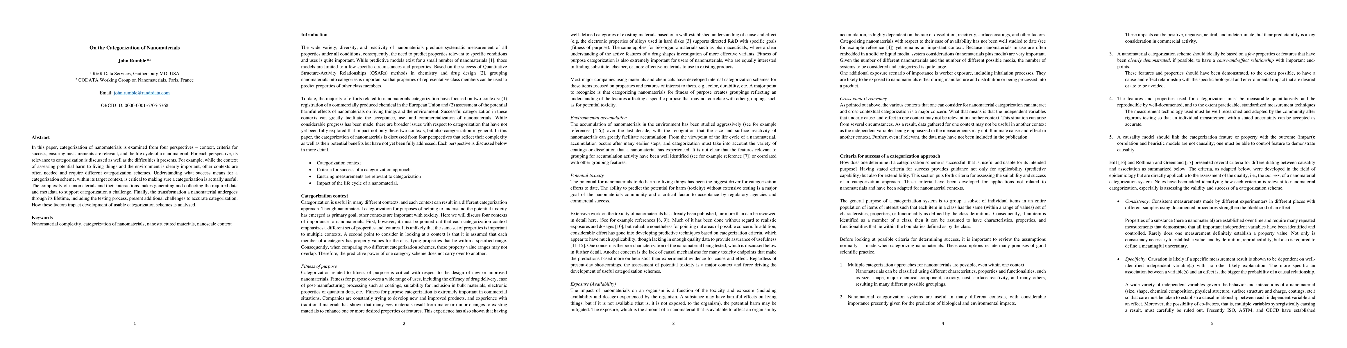 Researchers examined how to categorize nanomaterials from different perspectives, including context, success criteria, measurement relevance, and life cycle, highlighting the challenges of collecting data and metadata for accurate categorization.