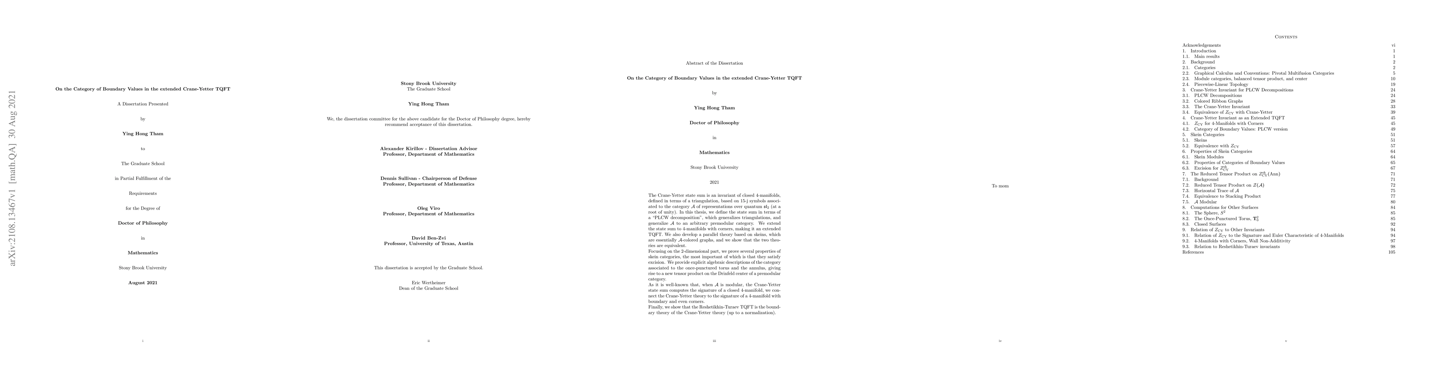 The Crane-Yetter state sum is an invariant of closed 4-manifolds, defined in terms of a triangulation, based on 15-j symbols associated to the category A of representations over quantum sl2 (at a root of unity). In this thesis, we define the state sum in terms of a 'PLCW decomposition', which generalizes triangulations, and generalize A to an arbitrary premodular category. We extend the state sum to 4-manifolds with corners, making it an extended TQFT. We also develop a parallel theory based on skeins, which are essentially A-colored graphs, and we show that the two theories are equivalent. Focusing on the 2-dimensional part, we prove several properties of skein categories, the most important of which is that they satisfy excision. We provide explicit algebraic descriptions of the category associated to the once-punctured torus and the annulus, giving rise to a new tensor product on the Drinfeld center of a premodular category. As it is well-known that, when A is modular, the Crane-Yetter state sum computes the signature of a closed 4-manifold, we connect the Crane-Yetter theory to the signature of a 4-manifold with boundary and even corners. Finally, we show that the Reshetikhin-Turaev TQFT is a boundary theory of the Crane-Yetter theory (up to a normalization).
