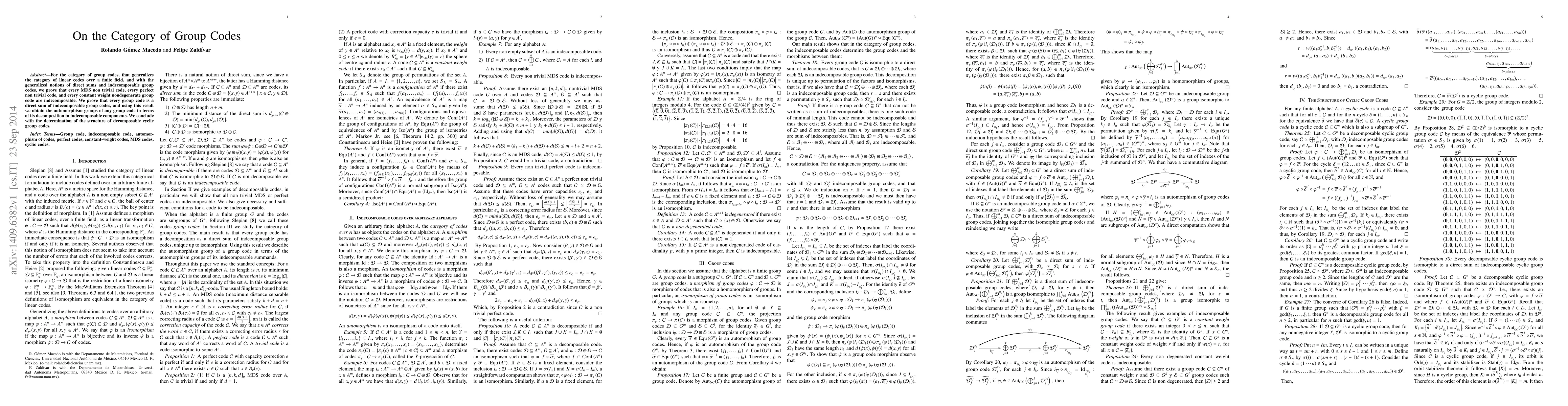 For the category of group codes, that generalizes the category of linear codes over a finite field, and with the generalized notions of direct sums and ndecomposable group codes, we prove that every MDS non trivial code, every perfect non trivial code, and every constant weight nondegenerate group code are indecomposable. We prove that every group code is a direct sum of indecomposable group codes, and using this result we obtain the automorphism groups of any group code in terms of its decomposition in indecomposable components. We conclude with the determination of the structure of decomposable cyclic group codes.