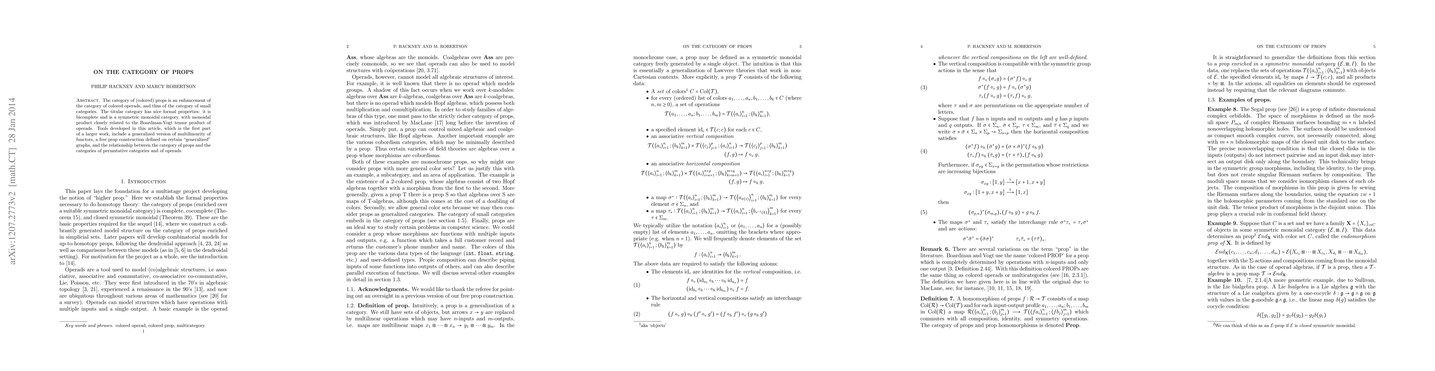The category of (colored) props is an enhancement of the category of colored operads, and thus of the category of small categories. The titular category has nice formal properties: it is bicomplete and is a symmetric monoidal category, with monoidal product closely related to the Boardman-Vogt tensor product of operads. Tools developed in this article, which is the first part of a larger work, include a generalized version of multilinearity of functors, a free prop construction defined on certain "generalized graphs", and the relationship between the category of props and the categories of permutative categories and of operads.