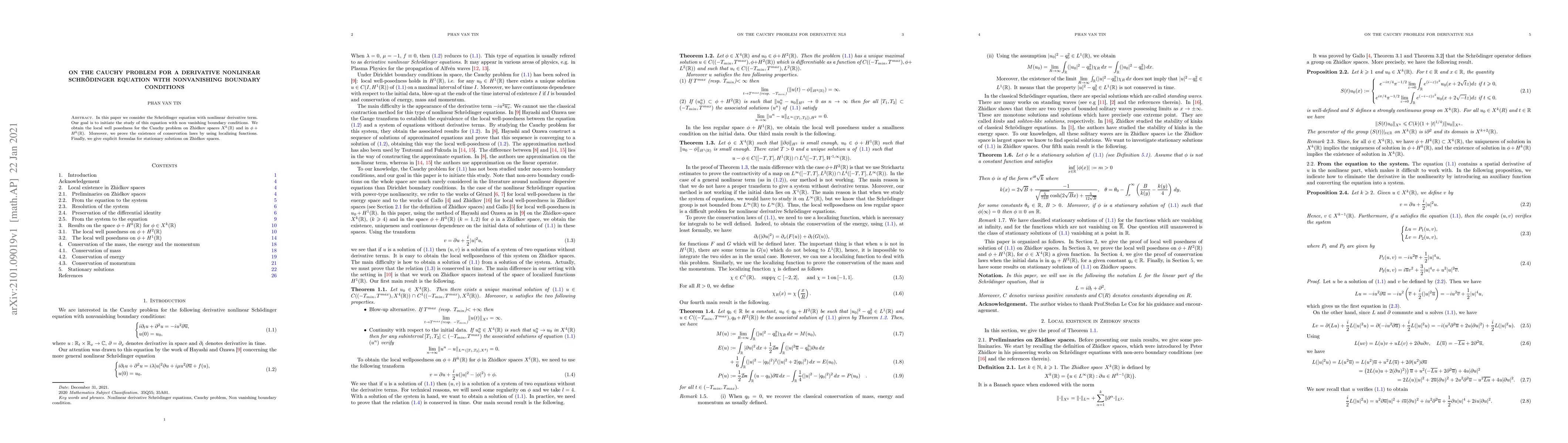 In this paper we consider the Schr{\"o}dinger equation with nonlinear derivative term. Our goal is to initiate the study of this equation with non vanishing boundary conditions. We obtain the local well posedness for the Cauchy problem on Zhidkov spaces X k (R) and in $\phi$ + H k (R). Moreover, we prove the existence of conservation laws by using localizing functions. Finally, we give explicit formulas for stationary solutions on Zhidkov spaces.