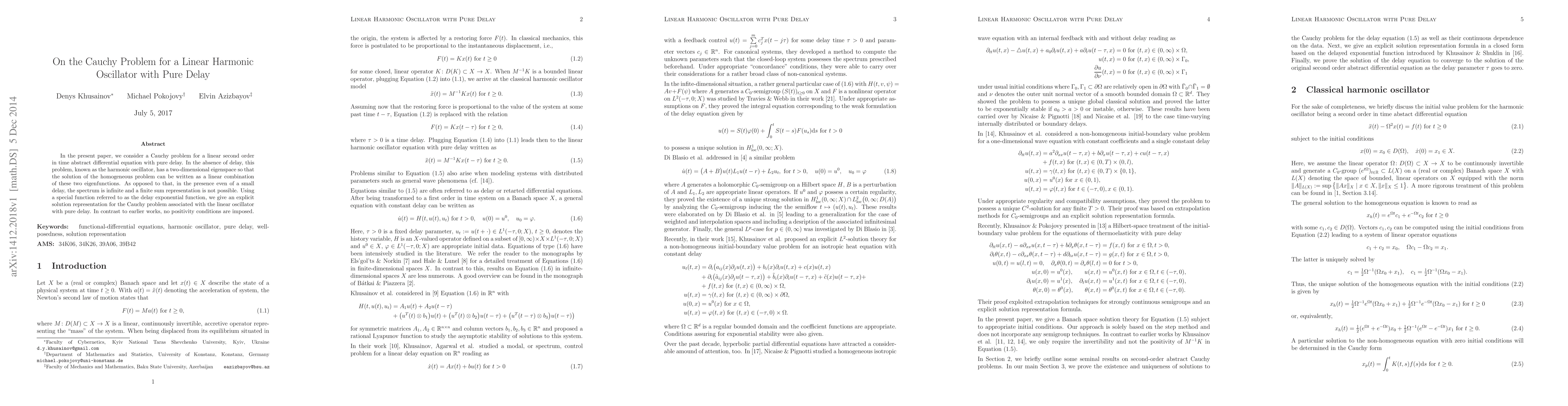 In the present paper, we consider a Cauchy problem for a linear second order in time abstract differential equation with pure delay. In the absence of delay, this problem, known as the harmonic oscillator, has a two-dimensional eigenspace so that the solution of the homogeneous problem can be written as a linear combination of these two eigenfunctions. As opposed to that, in the presence even of a small delay, the spectrum is infinite and a finite sum representation is not possible. Using a special function referred to as the delay exponential function, we give an explicit solution representation for the Cauchy problem associated with the linear oscillator with pure delay. In contrast to earlier works, no positivity conditions are imposed.