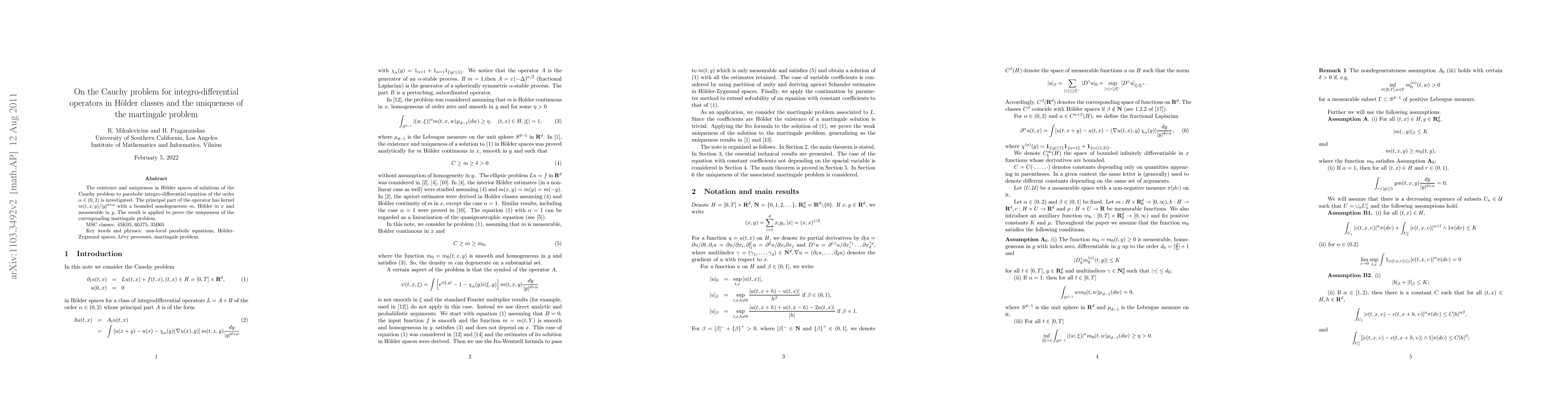The existence and uniqueness in H\"older spaces of solutions of the Cauchy problem to parabolic integro-differential equation of the order {\alpha}\in(0,2) is investigated. The principal part of the operator has kernel m(t,x,y)/|y|^{d+{\alpha}} with a bounded nondegenerate m, H\"older in x and measurable in y. The result is applied to prove the uniqueness of the corresponding martingale problem.