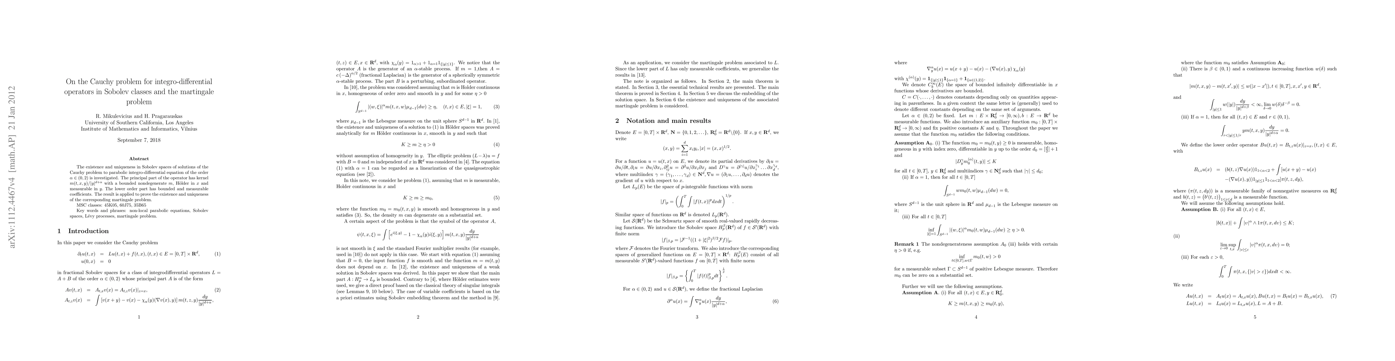 The existence and uniqueness in Sobolev spaces of solutions of the Cauchy problem to parabolic integro-differential equation of the order {\alpha}\in(0,2) is investigated. The principal part of the operator has kernel m(t,x,y)/|y|^{d+{\alpha}} with a bounded nondegenerate m, H\"older in x and measurable in y. The lower order part has bounded and measurable coefficients. The result is applied to prove the existence and uniqueness of the corresponding martingale problem.