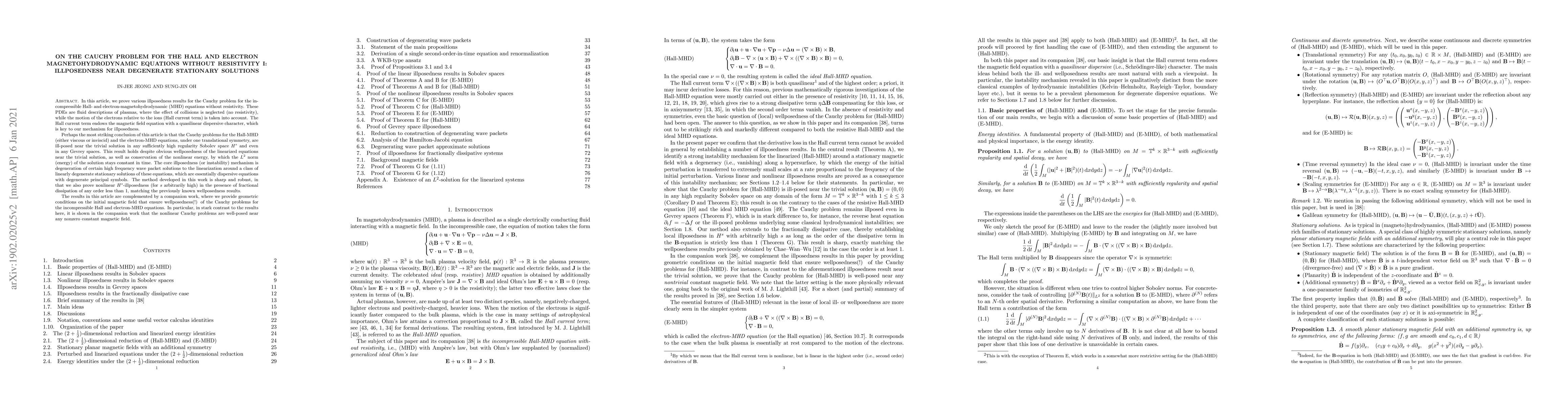 In this article, we prove various illposedness results for the Cauchy problem for the incompressible Hall- and electron-magnetohydrodynamic (MHD) equations without resistivity. These PDEs are fluid descriptions of plasmas, where the effect of collisions is neglected (no resistivity), while the motion of the electrons relative to the ions (Hall current term) is taken into account. The Hall current term endows the magnetic field equation with a quasilinear dispersive character, which is key to our mechanism for illposedness. Perhaps the most striking conclusion of this article is that the Cauchy problems for the Hall-MHD (either viscous or inviscid) and the electron-MHD equations, under one translational symmetry, are ill-posed near the trivial solution in any sufficiently high regularity Sobolev space and even in Gevrey spaces. This result holds despite obvious wellposedness of the linearized equations near the trivial solution, as well as conservation of the nonlinear energy, by which the $L^{2}$ norm (energy) of the solution stays constant in time. The core illposedness mechanism is degeneration of certain high frequency wave packet solutions to the linearization around a class of linearly degenerate stationary solutions of these equations, which are essentially dispersive equations with degenerate principal symbols. The method developed in this work is sharp and robust, in that we also prove nonlinear $H^{s}$-illposedness in the presence of fractional dissipation of any order less than 1, matching known wellposedness results. The results in this article are complemented by a companion work, where we provide geometric conditions on the initial magnetic field that ensure wellposedness(!) of the Cauchy problem. In particular, in stark contrast to the results here, it is shown in the companion work that the nonlinear Cauchy problems are well-posed near any nonzero constant magnetic field.