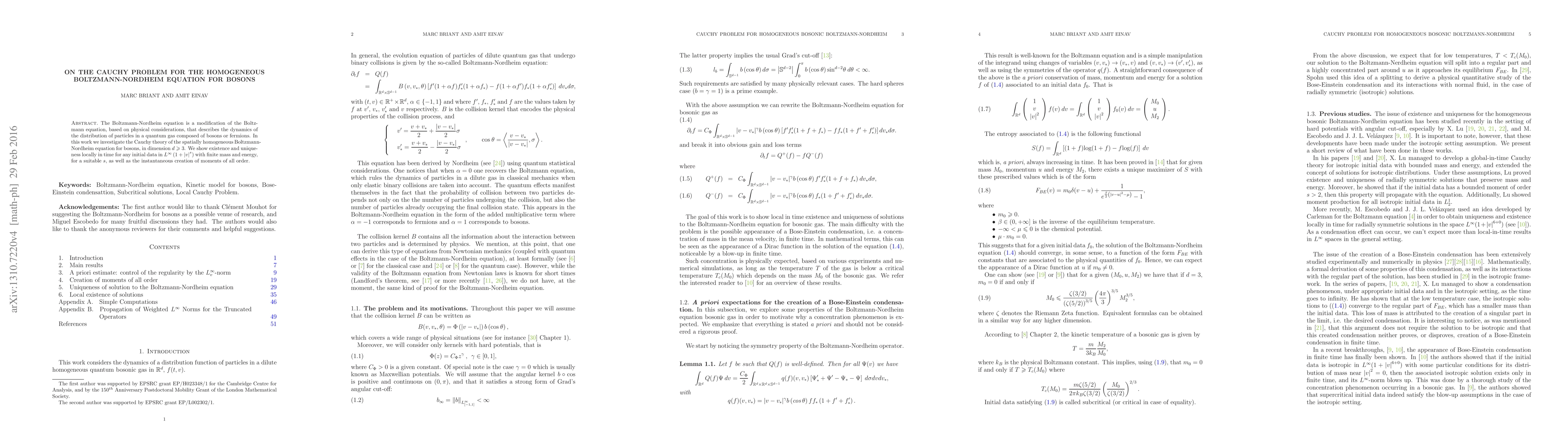 The Boltzmann-Nordheim equation is a modification of the Boltzmann equation, based on physical considerations, that describes the dynamics of the distribution of particles in a quantum gas composed of bosons or fermions. In this work we investigate the Cauchy theory of the spatially homogeneous Boltzmann-Nordheim equation for bosons, in dimension $d\geq 3$. We show existence and uniqueness locally in time for any initial data in $L^\infty\left(1+|v|^s\right)$ with finite mass and energy, for a suitable $s$, as well as the instantaneous creation of moments of all order.
