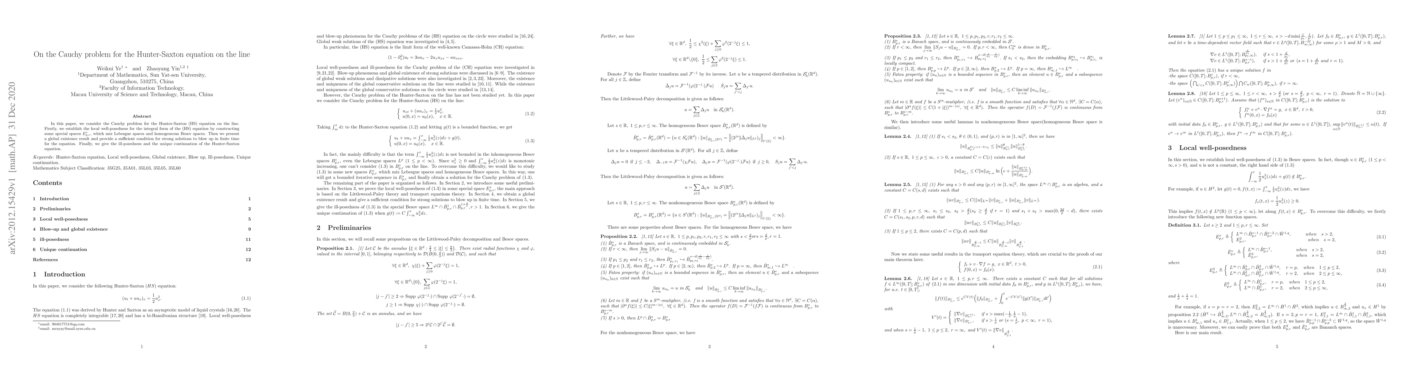 In this paper, we consider the Cauchy problem for the Hunter-Saxton (HS) equation on the line. Firstly, we establish the local well-posedness for the integral form of the (HS) equation by constructing some special spaces $E^s_{p,r}$, which mix Lebesgue spaces and homogeneous Besov spaces. Then we present a global existence result and provide a sufficient condition for strong solutions to blow up in finite time for the equation. Finally, we give the ill-posedness and the unique continuation of the Hunter-Saxton equation.