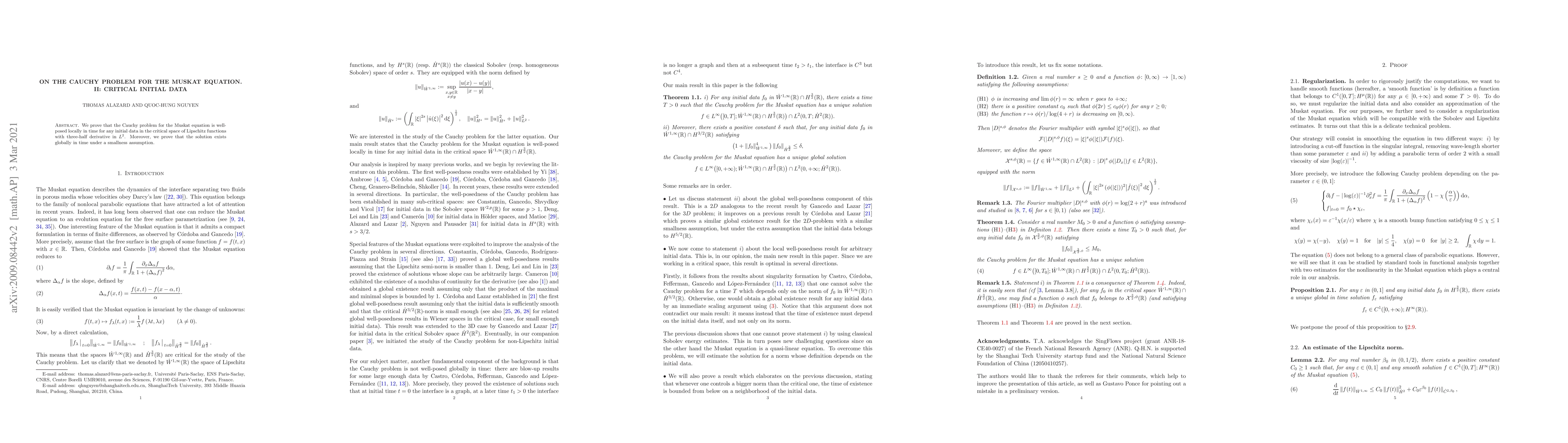 This paper proves local well-posedness of the Cauchy problem for the Muskat equation for initial data in a critical Lipschitz space with a three-half derivative in $L^2$. It also establishes global existence under a smallness condition on the initial data.