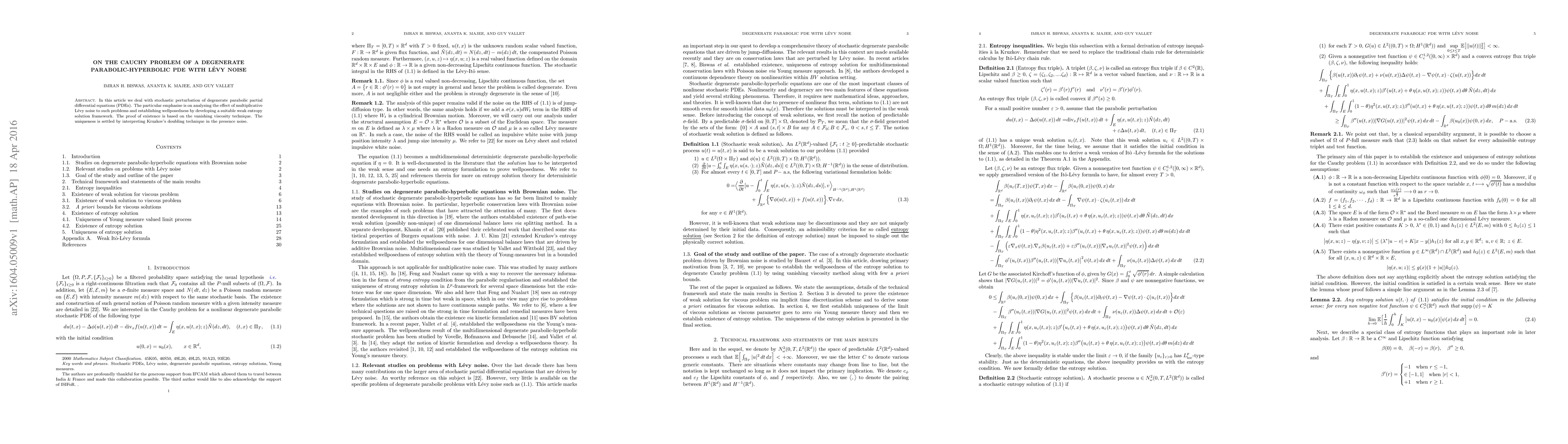 This paper investigates the stochastic perturbation of degenerate parabolic PDEs under multiplicative Lévy noise, establishing wellposedness through a weak entropy solution framework. The existence is proven via vanishing viscosity, and uniqueness is achieved using Kruzkov's doubling technique adapted for noise.