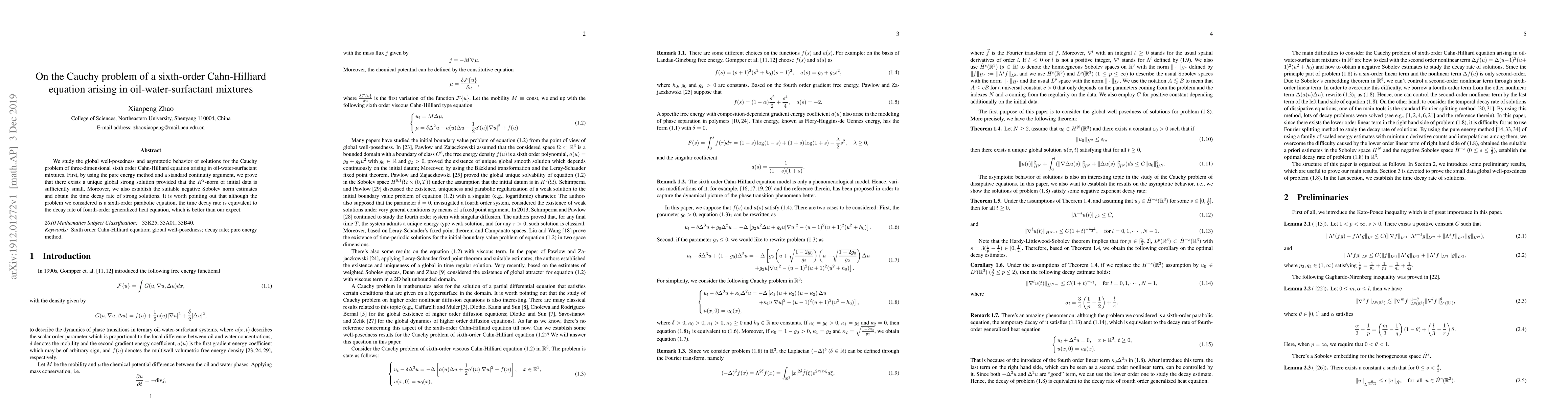 This paper investigates the global well-posedness and asymptotic behavior of solutions for a three-dimensional sixth-order Cahn-Hilliard equation in oil-water-surfactant mixtures. The authors prove the existence of a unique global strong solution for small initial data and establish time decay rates, showing better decay than expected for a sixth-order equation.
