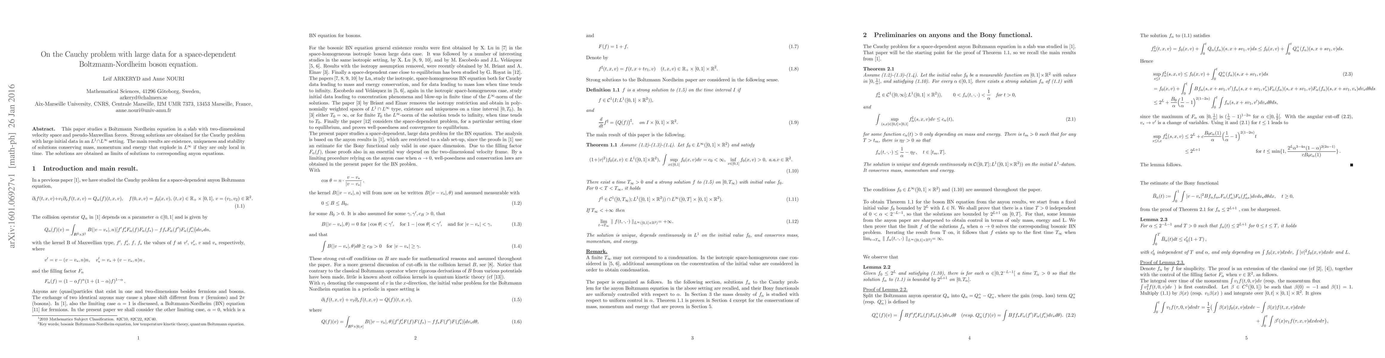 The paper studies a Boltzmann-Nordheim equation in 2D space with large initial data, showing strong solutions that conserve mass and energy; they either explode or exist globally.