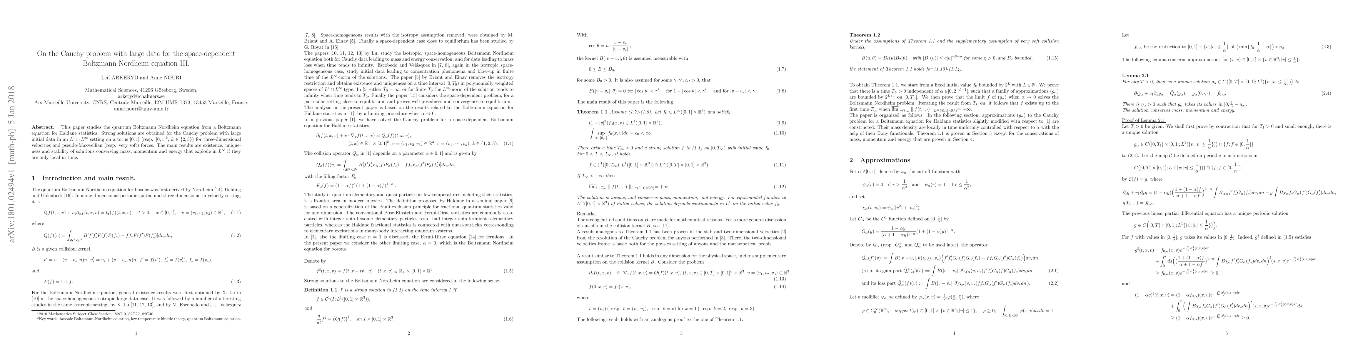This paper studies the quantum Boltzmann Nordheim equation from a Boltzmann equation for Haldane statistics. Strong solutions are obtained for the Cauchy problem with initial data in L1 and uniformly bounded on a one (resp. two or three)-dimensional torus for three-dimensional velocities and pseudo-Maxwellian (resp. very soft) forces. The main results are existence, uniqueness and stability of solutions conserving mass, momentum, and energy, with the uniform bound exploding if the solutions are only local in time.