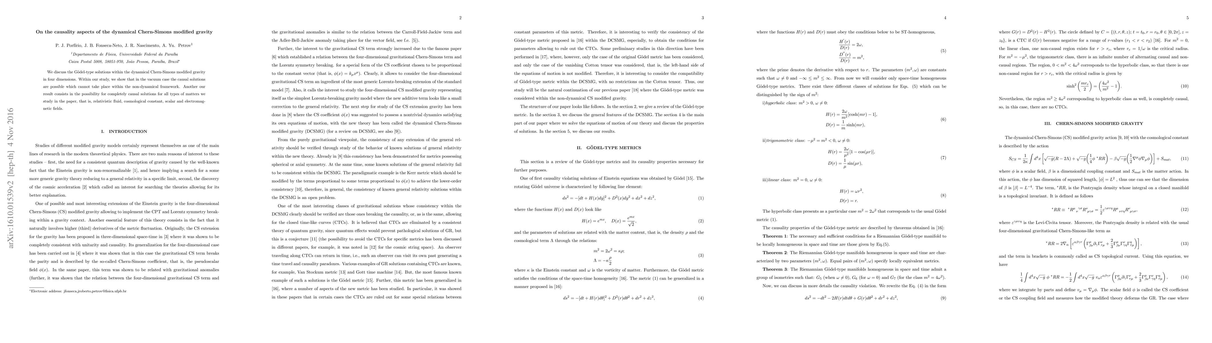 This paper explores causal solutions in dynamical Chern-Simons modified gravity, finding that vacuum solutions exist only in this framework and that completely causal solutions are possible for various types of matter, including relativistic fluid, cosmological constant, scalar fields, and electromagnetic fields.