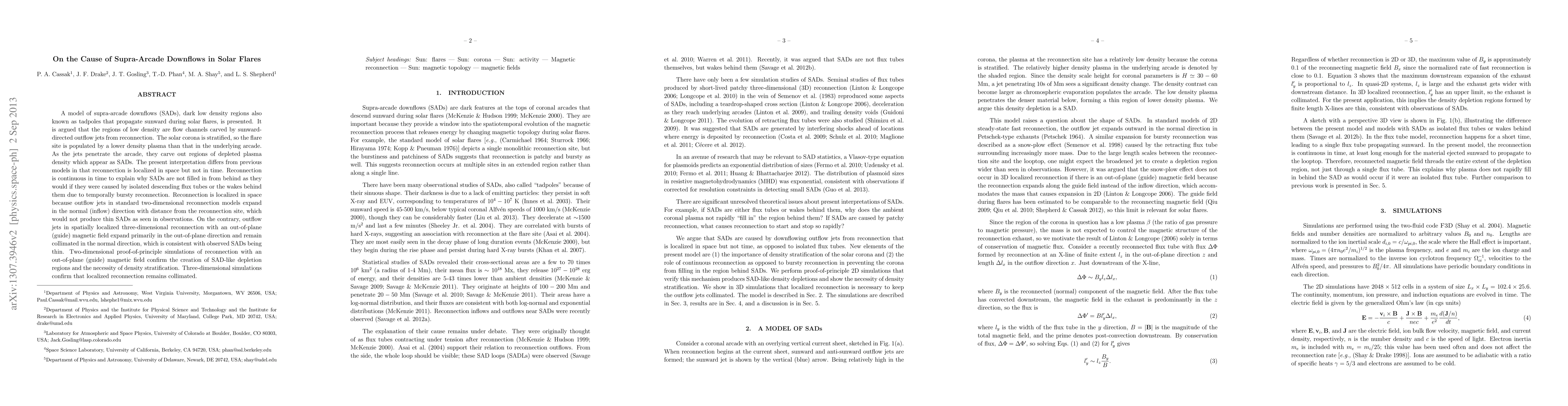 A model of supra-arcade downflows (SADs), dark low density regions also known as tadpoles that propagate sunward during solar flares, is presented. It is argued that the regions of low density are flow channels carved by sunward-directed outflow jets from reconnection. The solar corona is stratified, so the flare site is populated by a lower density plasma than that in the underlying arcade. As the jets penetrate the arcade, they carve out regions of depleted plasma density which appear as SADs. The present interpretation differs from previous models in that reconnection is localized in space but not in time. Reconnection is continuous in time to explain why SADs are not filled in from behind as they would if they were caused by isolated descending flux tubes or the wakes behind them due to temporally bursty reconnection. Reconnection is localized in space because outflow jets in standard two-dimensional reconnection models expand in the normal (inflow) direction with distance from the reconnection site, which would not produce thin SADs as seen in observations. On the contrary, outflow jets in spatially localized three-dimensional reconnection with an out-of-plane (guide) magnetic field expand primarily in the out-of-plane direction and remain collimated in the normal direction, which is consistent with observed SADs being thin. Two-dimensional proof-of-principle simulations of reconnection with an out-of-plane (guide) magnetic field confirm the creation of SAD-like depletion regions and the necessity of density stratification. Three-dimensional simulations confirm that localized reconnection remains collimated.