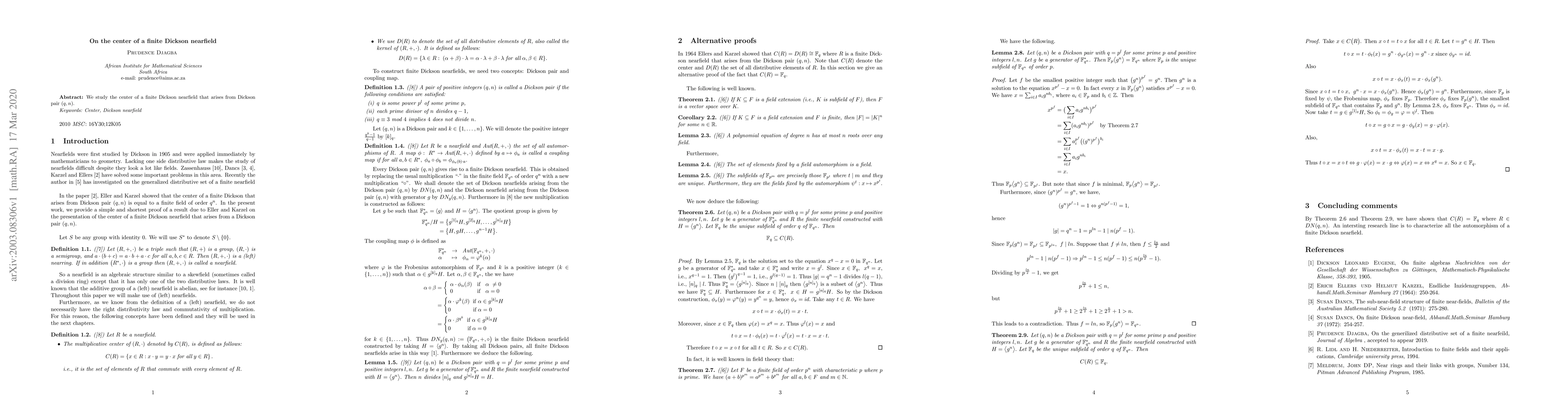 We study the center of a finite Dickson nearfield that arises from a Dickson pair.