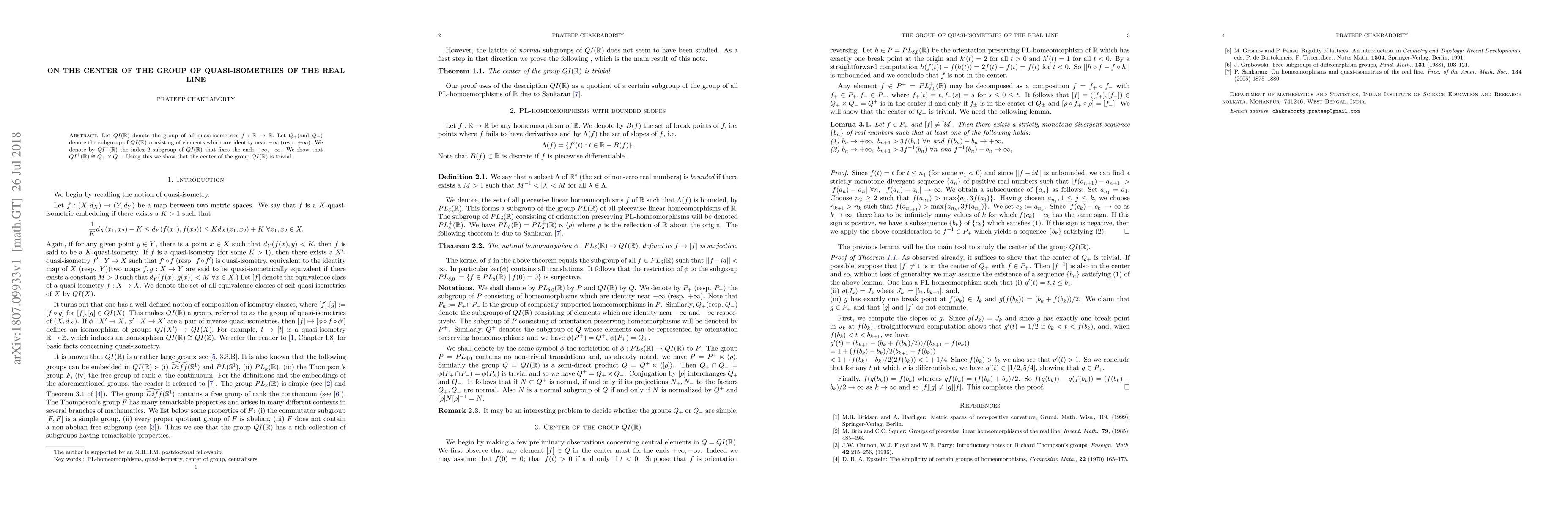 This paper investigates the group of quasi-isometries of the real line, $QI(\mathbb{R})$, and demonstrates that its center is trivial. The authors show that the subgroup fixing the ends, $QI^+(\mathbb{R})$, is isomorphic to the direct product of subgroups $Q_+$ and $Q_-$.