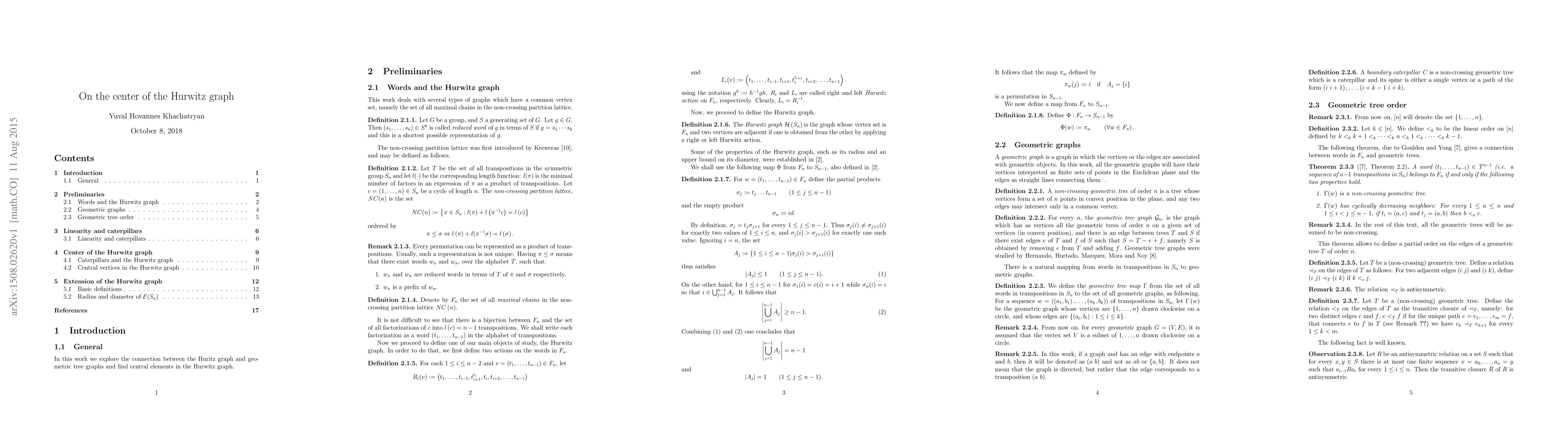 For any natural number n, the Hurwitz graph $\mathcal{H}(S_n )$ has vertices corresponding to reduced words of the cycle $(1 . . . n)$ in terms of transpositions in $S_n$, and has edges corresponding to local shifts. This graph is known to be connected, and some of its graph theoretic properties, such as its radius and upper bounds on its diameter, are known. We explore further the structure of the Hurwitz Graph, in particular its center and its connection to the geometric tree graph $G_n$. Finally, the extended Hurwitz Graph is defined and its properties such as the radius, characterization of some central elements and bounds on the diameter are obtained. Part of fulfillment of the requirements for the Master's Degree.