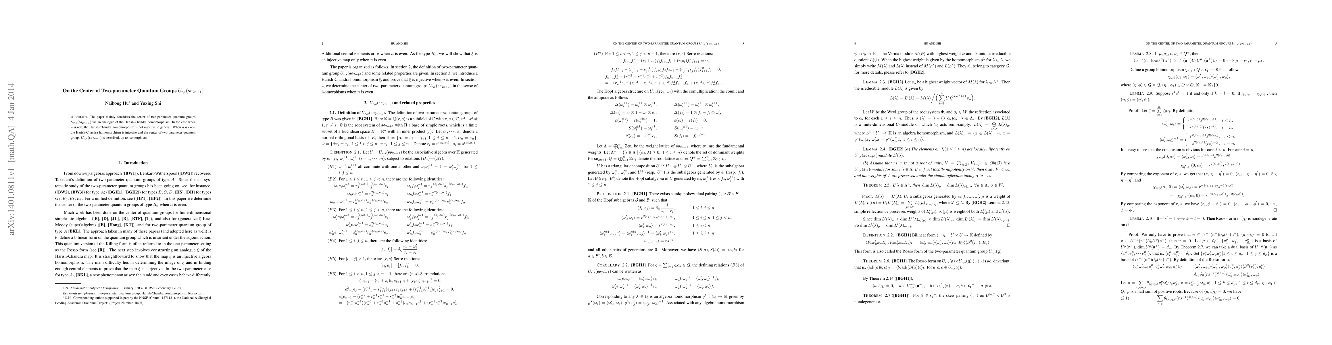 This paper investigates the center of two-parameter quantum groups $U_{r,s}(\mathfrak{so}_{2n+1})$ using an analogue of the Harish-Chandra homomorphism, finding that the homomorphism is generally not injective for odd $n$, but is injective for even $n$, allowing a description of the group's center up to isomorphism.