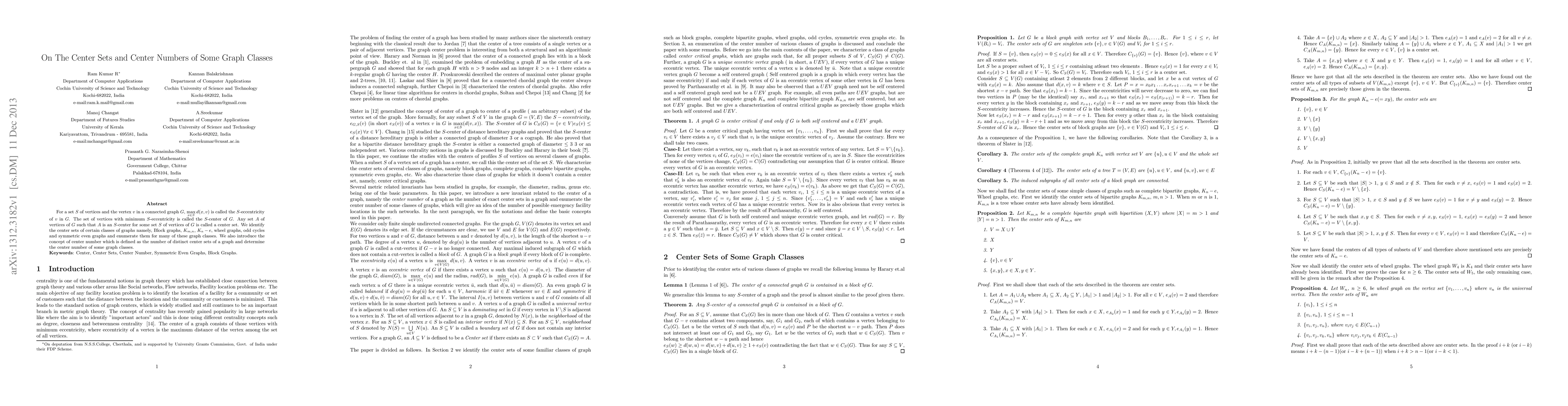 This research paper identifies center sets for various graph classes, including Block graphs, complete and incomplete K-matrices, wheel graphs, odd cycles, and symmetric even graphs, and explores the concept of center number as a measure of distinct center sets.