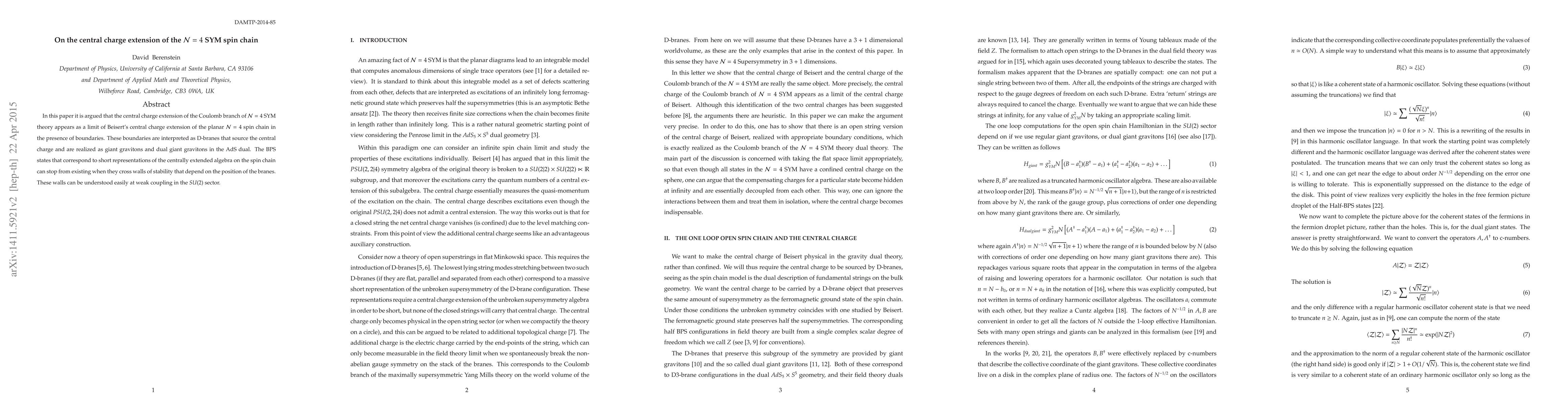 In this paper it is argued that the central charge extension of the Coulomb branch of ${\cal N}=4 $ SYM theory appears as a limit of Beisert's central charge extension of the planar ${\cal N}=4 $ spin chain in the presence of boundaries. These boundaries are interpreted as D-branes that source the central charge and are realized as giant gravitons and dual giant gravitons in the AdS dual. The BPS states that correspond to short representations of the centrally extended algebra on the spin chain can stop from existing when they cross walls of stability that depend on the position of the branes. These walls can be understood easily at weak coupling in the $SU(2)$ sector.
