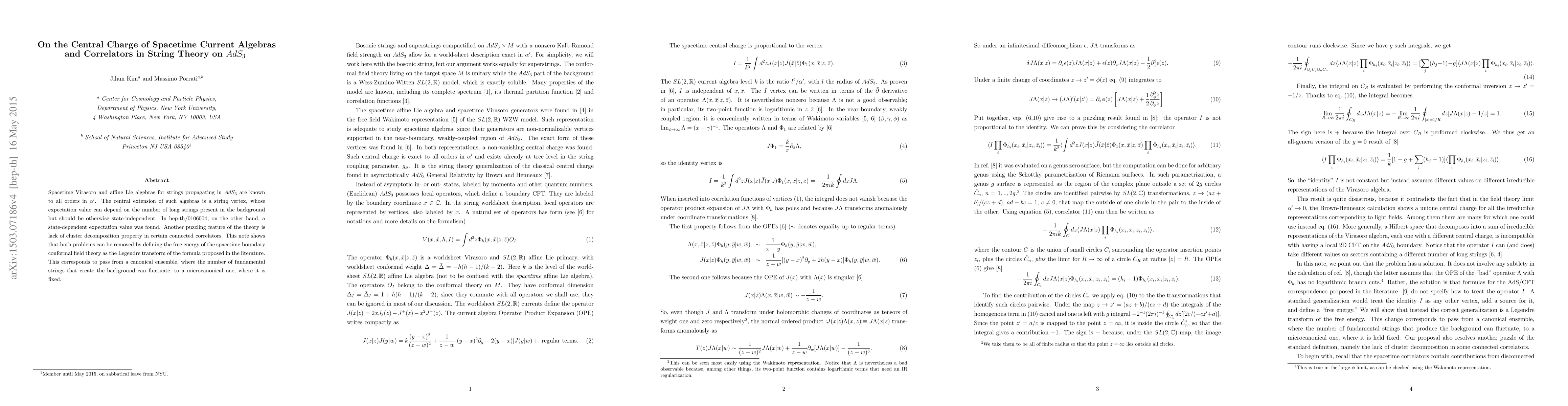 Spacetime Virasoro and affine Lie algebras for strings propagating in AdS3 are known to all orders in $\alpha'$. The central extension of such algebras is a string vertex, whose expectation value can depend on the number of long strings present in the background but should be otherwise state-independent. In hep-th/0106004, on the other hand, a state-dependent expectation value was found. Another puzzling feature of the theory is lack of cluster decomposition property in certain connected correlators. This note shows that both problems can be removed by defining the free energy of the spacetime boundary conformal field theory as the Legendre transform of the formula proposed in the literature. This corresponds to pass from a canonical ensemble, where the number of fundamental strings that create the background can fluctuate, to a microcanonical one, where it is fixed.