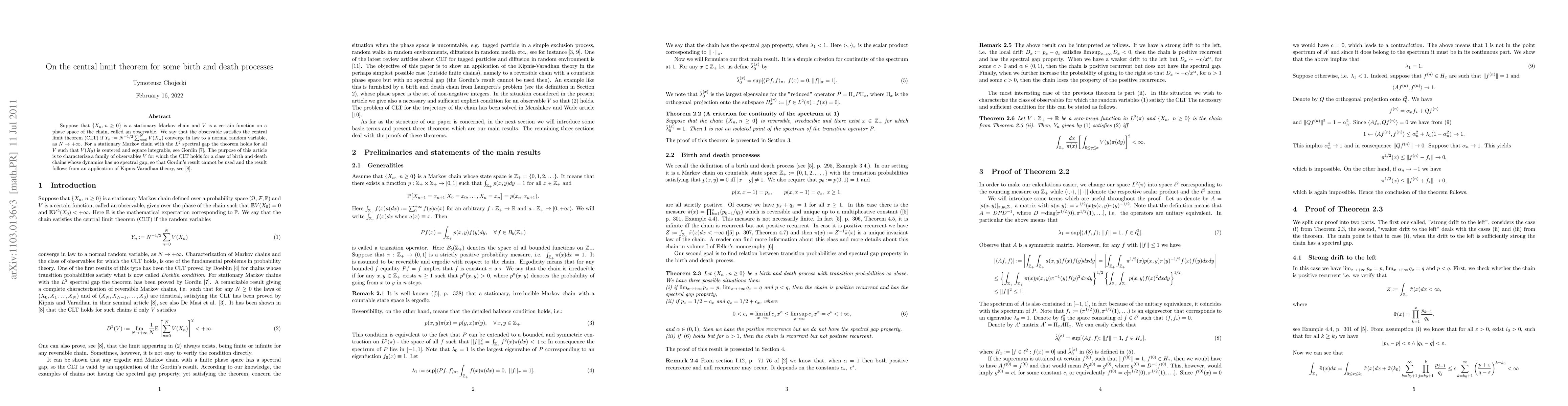 Suppose that X_n, n>=0 is a stationary Markov chain and V is a certain function on a phase space of the chain, called an observanle. We say that the observable satisfies the central limit theorem (C.L.T.) if Y_n:=N^{-1/2}\sum_{n=0}^NV(X_n) converge in law to a normal random variable, as N goes to infinity. For a stationary Markov chain with the L^2 spectral gap the theorem holds for all V such that V(X_0) is centered and square integrable, see Gordin. The purpose of this article is to characterize a family of observables V for which the C.L.T. holds for a class of birth and death chains whose dynamics has no spectral gap, so that Gordin's result cannot be used and the result follows from an application of Kipnis-Varadhan theory.