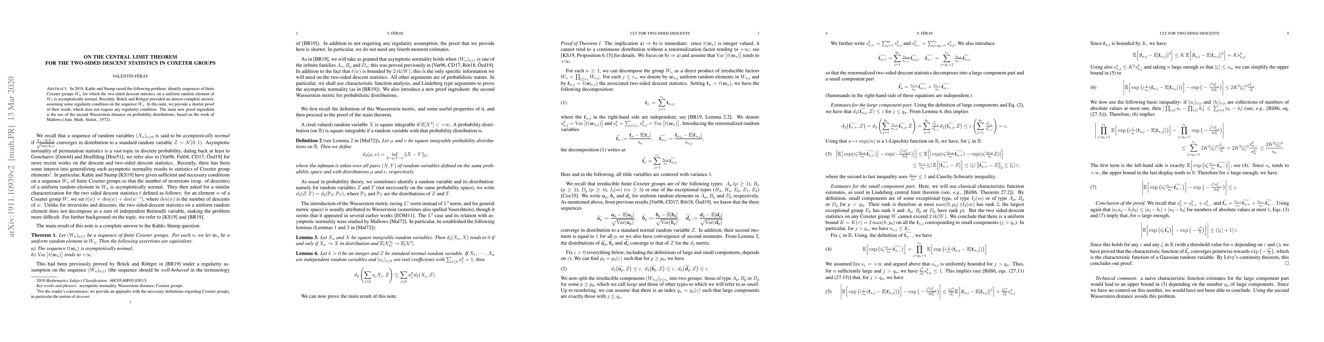 In 2018, Kahle and Stump raised the following problem: identify sequences of finite Coxeter groups $W_n$ for which the two-sided descent statistics on a uniform random element of $W_n$ is asymptotically normal. Recently, Br\"uck and R\"ottger provided an almost-complete answer, assuming some regularity condition on the sequence $W_n$. In this note, we provide a shorter proof of their result, which does not require any regularity condition. The main new proof ingredient is the use of the second Wasserstein distance on probability distributions, based on the work of Mallows (1972).