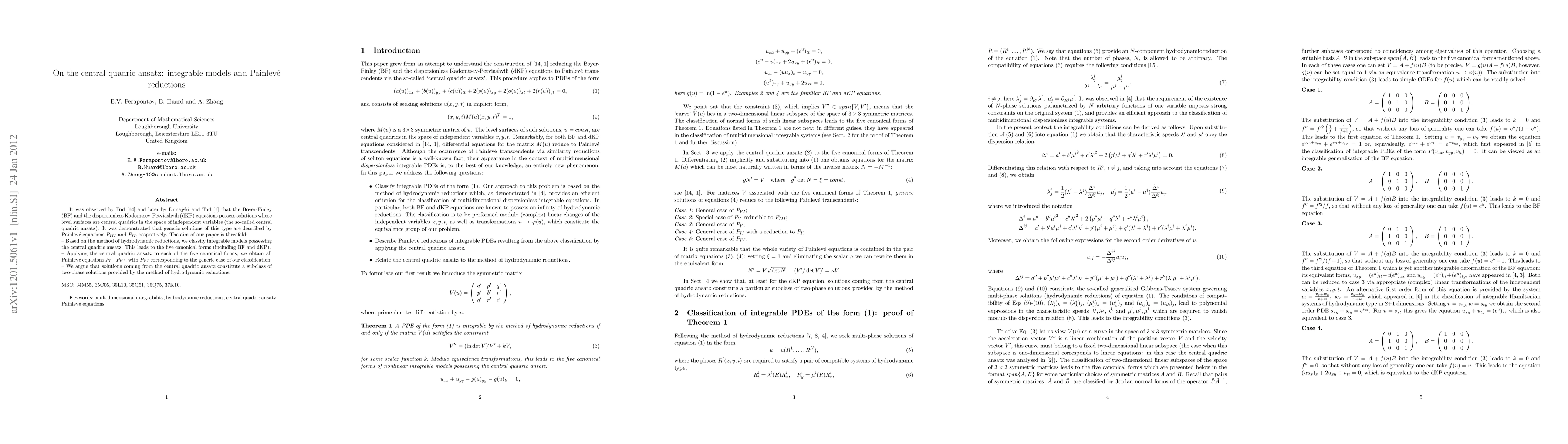 It was observed by Tod and later by Dunajski and Tod that the Boyer-Finley (BF) and the dispersionless Kadomtsev-Petviashvili (dKP) equations possess solutions whose level surfaces are central quadrics in the space of independent variables (the so-called central quadric ansatz). It was demonstrated that generic solutions of this type are described by Painleve equations PIII and PII, respectively. The aim of our paper is threefold: -- Based on the method of hydrodynamic reductions, we classify integrable models possessing the central quadric ansatz. This leads to the five canonical forms (including BF and dKP). -- Applying the central quadric ansatz to each of the five canonical forms, we obtain all Painleve equations PI - PVI, with PVI corresponding to the generic case of our classification. -- We argue that solutions coming from the central quadric ansatz constitute a subclass of two-phase solutions provided by the method of hydrodynamic reductions.