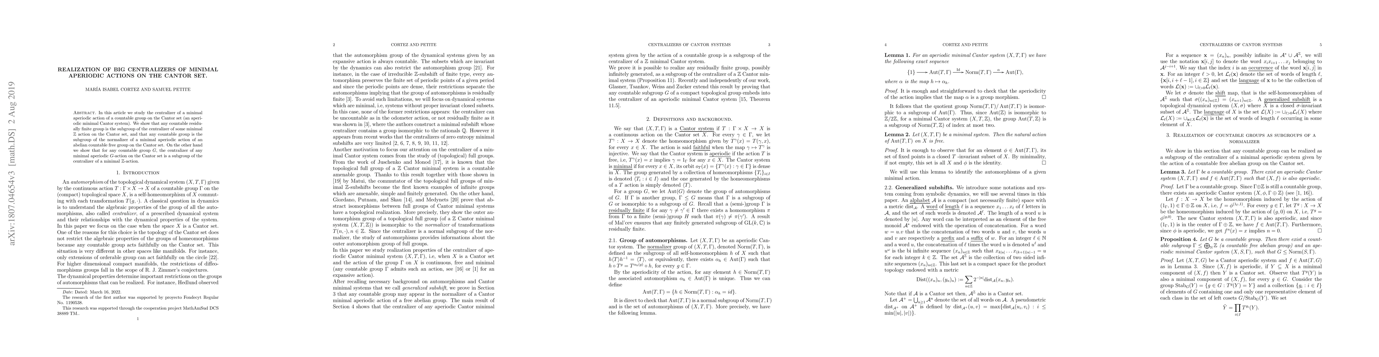 This paper investigates the centralizers of minimal aperiodic actions on the Cantor set, proving that any countable residually finite group is a subgroup of the centralizer of some minimal $\mathbb{Z}$ action, and any countable group is a subgroup of the normalizer of a minimal aperiodic action of an abelian free group. It also shows that the centralizer of any minimal $G$-action is a subgroup of the centralizer of a minimal $\mathbb{Z}$-action for any countable group $G$.