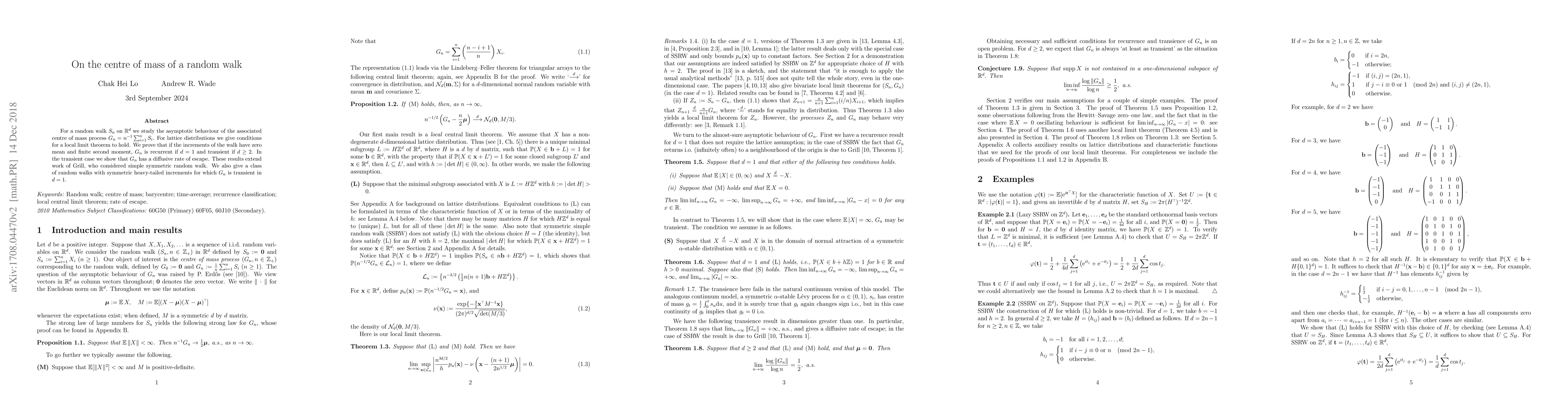 For a random walk $S_n$ on $\mathbb{R}^d$ we study the asymptotic behaviour of the associated centre of mass process $G_n = n^{-1} \sum_{i=1}^n S_i$. For lattice distributions we give conditions for a local limit theorem to hold. We prove that if the increments of the walk have zero mean and finite second moment, $G_n$ is recurrent if $d=1$ and transient if $d \geq 2$. In the transient case we show that $G_n$ has diffusive rate of escape. These results extend work of Grill, who considered simple symmetric random walk. We also give a class of random walks with symmetric heavy-tailed increments for which $G_n$ is transient in $d=1$.