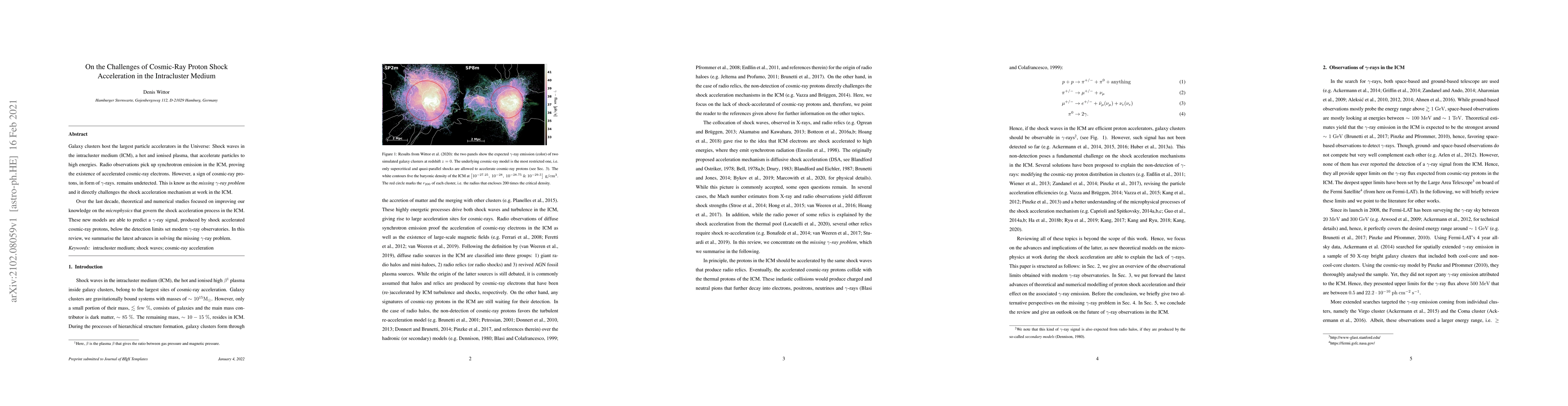 This paper reviews recent theoretical and numerical advancements addressing the missing $\gamma$-ray problem in galaxy clusters, where shock waves are expected to accelerate cosmic-ray protons but their $\gamma$-ray signature remains undetected, challenging the current understanding of shock acceleration mechanisms in the intracluster medium.