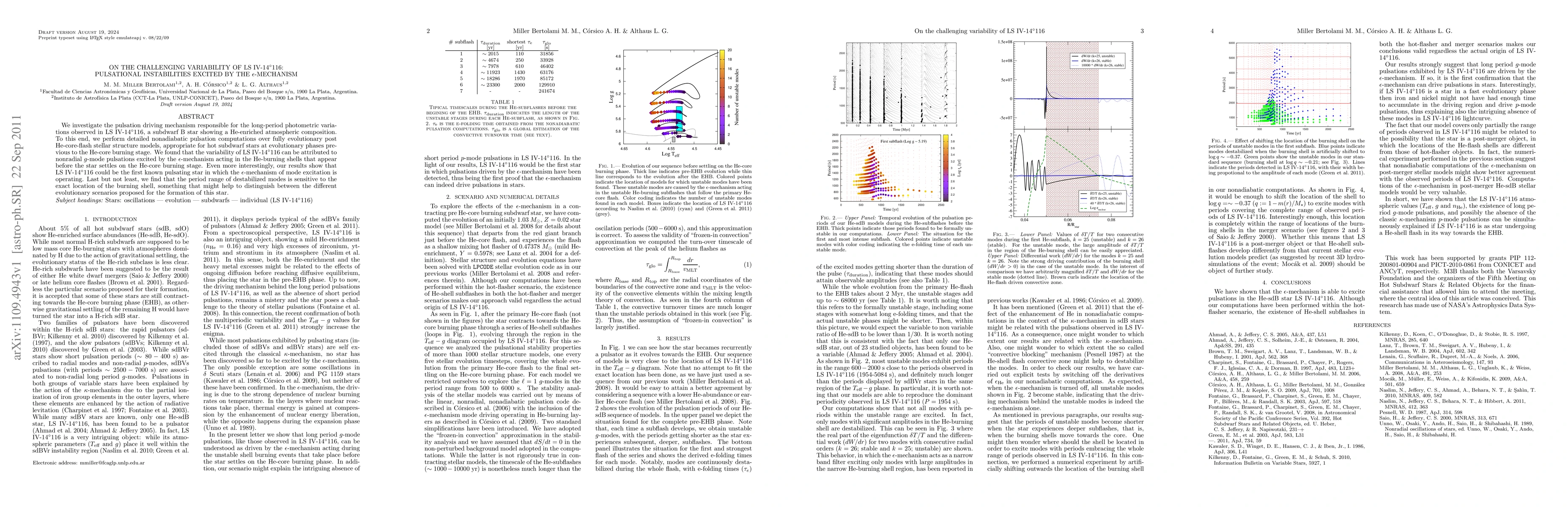 This paper investigates the pulsation mechanism behind the long-period variations in LS IV-14{\deg}116, a He-enriched subdwarf B star, finding it to be driven by nonradial g-mode pulsations via the {\epsilon}-mechanism. The study suggests this may be the first observed instance of the {\epsilon}-mechanism in a pulsating star, with the period range of destabilized modes sensitive to the burning shell's location.