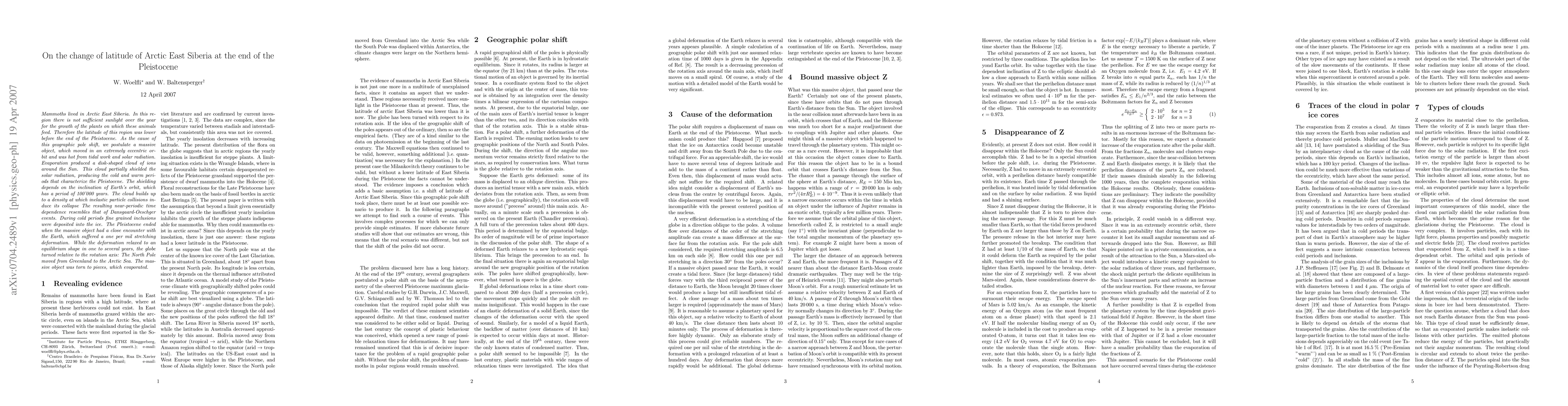 Mammoths lived in Arctic East Siberia. In this region there is not sufficient sunlight over the year for the growth of the plants on which these animals feed. Therefore the latitude of this region was lower before the end of the Pleistocene. As the cause of this geographic pole shift, we postulate a massive object, which moved in an extremely eccentric orbit and was hot from tidal work and solar radiation. Evaporation produced a disk-shaped cloud of ions around the Sun. This cloud partially shielded the solar radiation, producing the cold and warm periods that characterize the Pleistocene. The shielding depends on the inclination of Earth's orbit, which has a period of 100'000 years. The cloud builds up to a density at which inelastic particle collisions induce its collapse The resulting near-periodic time dependence resembles that of Dansgaard-Oeschger events. During cold periods fine grained inclusions were deposited into the ice. The Pleistocene ended when the massive object had a close encounter with the Earth, which suffered a one per mil stretching deformation. While the deformation relaxed to an equilibrium shape in one to several years, the globe turned relative to the rotation axis: The North Pole moved from Greenland to the Arctic Sea. The massive object was torn to pieces, which evaporated.