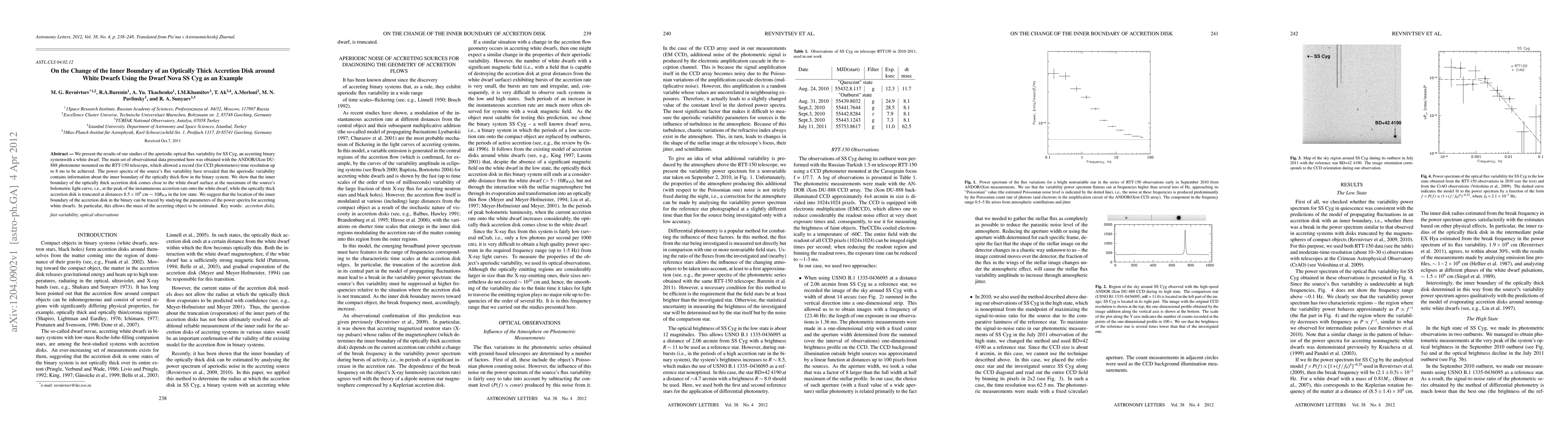 We present the results of our studies of the aperiodic optical flux variability for SS Cyg, an accreting binary systemwith a white dwarf. The main set of observational data presented here was obtained with the ANDOR/iXon DU-888 photometer mounted on the RTT-150 telescope, which allowed a record(for CCD photometers) time resolution up to 8 ms to be achieved. The power spectra of the source's flux variability have revealed that the aperiodic variability contains information about the inner boundary of the optically thick flow in the binary system. We show that the inner boundary of the optically thick accretion disk comes close to the white dwarf surface at the maximum of the source's bolometric light curve, i.e., at the peak of the instantaneous accretion rate onto the white dwarf, while the optically thick accretion disk is truncated at distances 8.5e9 cm ~10 R_{WD} in the low state. We suggest that the location of the inner boundary of the accretion disk in the binary can be traced by studying the parameters of the power spectra for accreting white dwarfs. In particular, this allows the mass of the accreting object to be estimated.