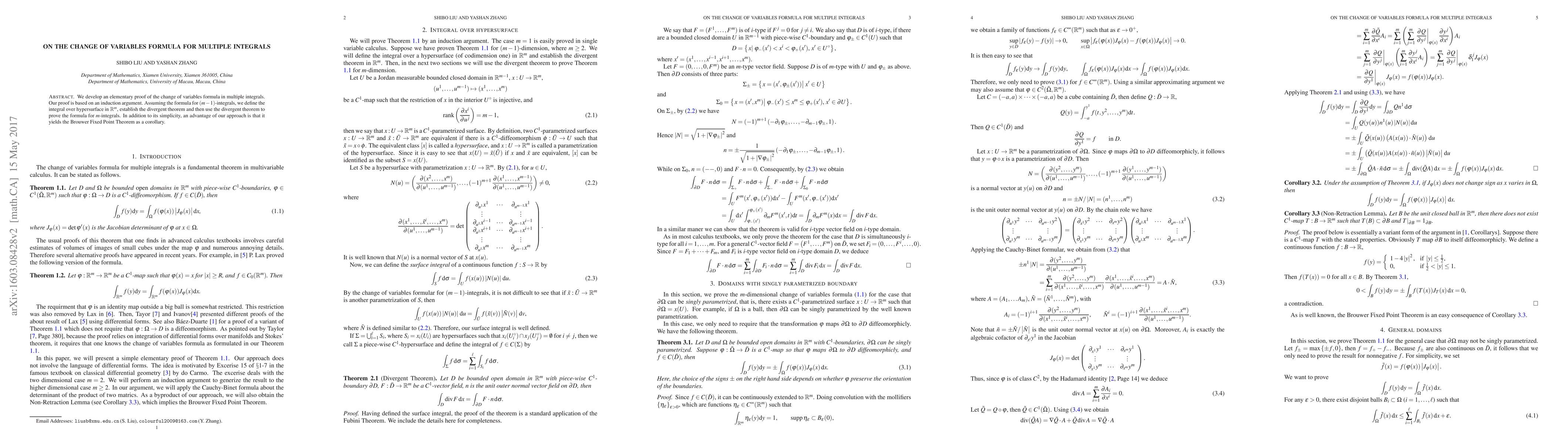 In this paper, we develop an elementary proof of the change of variables in multiple integrals. Our proof is based on an induction argument. Assuming the formula for (m-1)-integrals, we define the integral over hypersurface in Rm, establish the divergent theorem and then use the divergent theorem to prove the formula for m-integrals. In addition to its simplicity, an advantage of our approach is that it yields the Brouwer Fixed Point Theorem as a corollary.