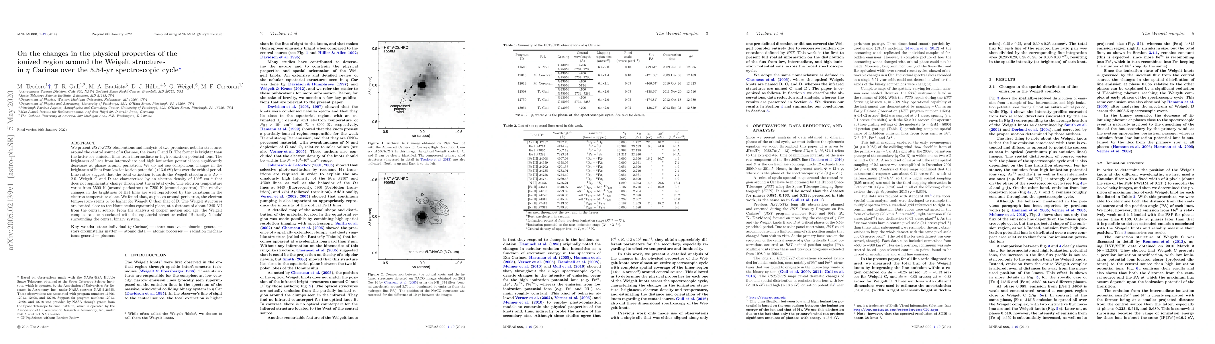 We present HST/STIS observations and analysis of two prominent nebular structures around the central source of Eta Carinae, the knots C and D. The former is brighter than the latter for emission lines from intermediate or high ionization potential ions. The brightness of lines from intermediate and high ionization potential ions significantly decreases at phases around periastron. We do not see conspicuous changes in the brightness of lines from low ionization potential (<13.6 eV) that the total extinction towards the Weigelt structures is that the total extinction towards the Weigelt structures is AsubV =2/0. that the total extinction towards the Weigelt structures is AV = 2.0. Weigelt C and D are characterized by an electron density of that the total extinction towards the Weigelt structures is AV = 2.0. Weigelt C and D are characterized by an electron density of 10exp6.9 cm-3 that does not significantly change throughout the orbital cycle. The electron temperature varies from 5500 K (around periastron) to 7200 K (around apastron). The relative changes in the brightness of He I lines are well reproduced by the variations in the electron temperature alone. We found that, at phases around periastron, the electron temperature seems to be higher for Weigelt C than that of D. The Weigelt structures are located close to the Homunculus equatorial plane, at a distance of about 1240 AU from the central source. From the analysis of proper motion and age, the Weigelt complex can be associated with the equatorial structure called the Butterfly Nebula surrounding the central binary system.