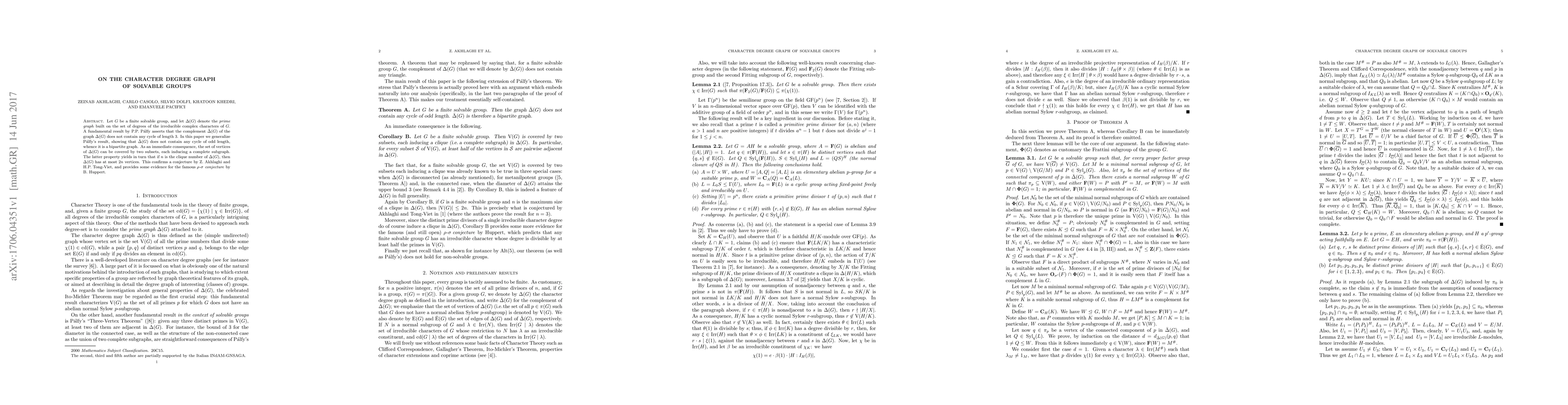 Let \(G\) be a finite solvable group, and let \(\Delta(G)\) denote the \emph{prime graph} built on the set of degrees of the irreducible complex characters of \(G\). A fundamental result by P.P. P\'alfy asserts that the complement $\bar{\Delta}(G)$ of the graph \(\Delta(G)\) does not contain any cycle of length \(3\). In this paper we generalize P\'alfy's result, showing that $\bar{\Delta}(G)$ does not contain any cycle of odd length, whence it is a bipartite graph. As an immediate consequence, the set of vertices of \(\Delta(G)\) can be covered by two subsets, each inducing a complete subgraph. The latter property yields in turn that if \(n\) is the clique number of \(\Delta(G)\), then \(\Delta(G)\) has at most \(2n\) vertices. This confirms a conjecture by Z. Akhlaghi and H.P. Tong-Viet, and provides some evidence for the famous \emph{\(\rho\)-\(\sigma\) conjecture} by B. Huppert.