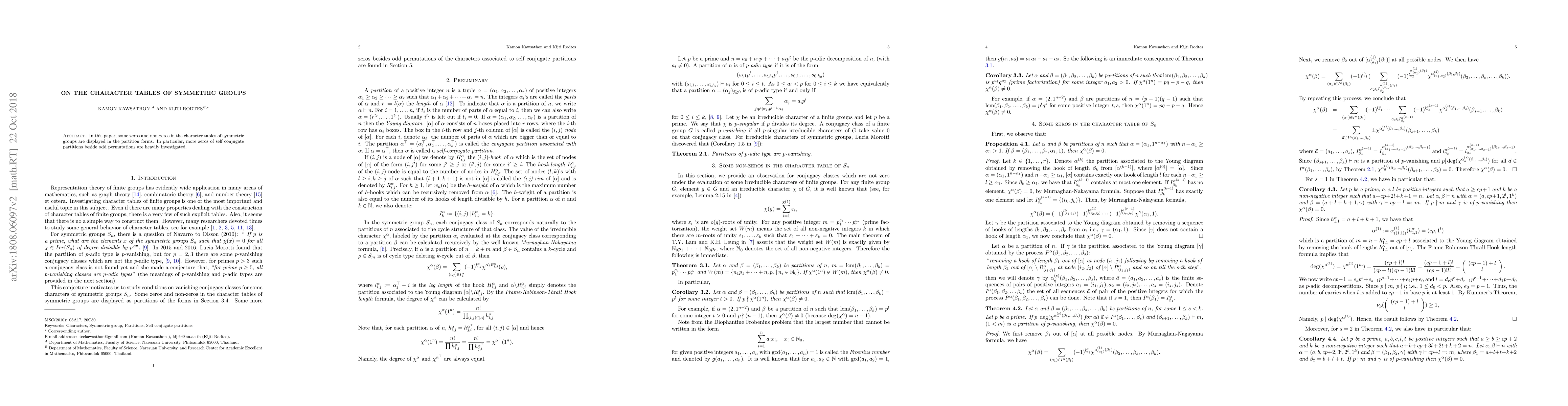 This paper investigates the character tables of symmetric groups, focusing on the zeros and non-zeros in their partition forms, with a special emphasis on additional zeros of self-conjugate partitions beyond those from odd permutations.