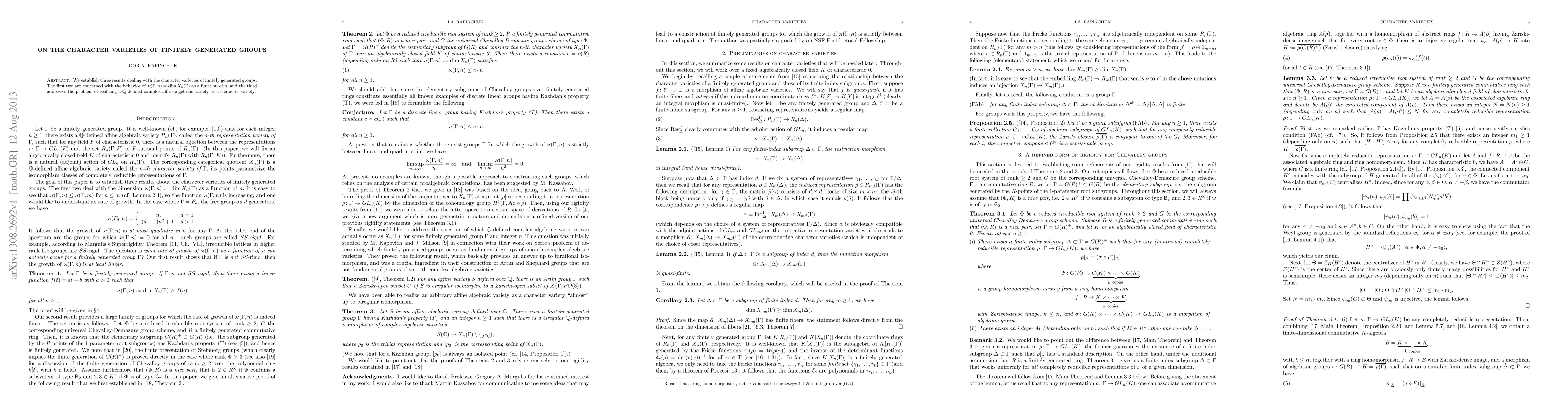 We establish three results dealing with the character varieties of finitely generated groups. The first two are concerned with the behavior of $\dim X_n(\Gamma)$ as a function of $n$, and the third addresses the problem of realizing a $\mathbb{Q}$-defined complex affine algebraic variety as a character variety.